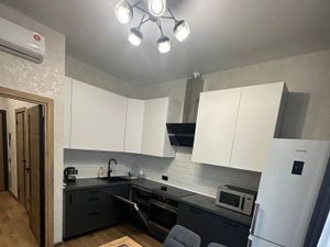 Вся мебель в квартире дизайнерская, благодаря этому создана атмосфера уникальности, комфорта и уюта. Здесь есть всё необходимое для комфортного проживания: кондиционер, холодильник, посудомоечная и стиральная машины, телевизор, сушилка для белья. Можно сразу заехать и жить без дополнительных хлопот и затрат. Санузел совмещённый, оборудован ванной, зеркалом-шкафом.