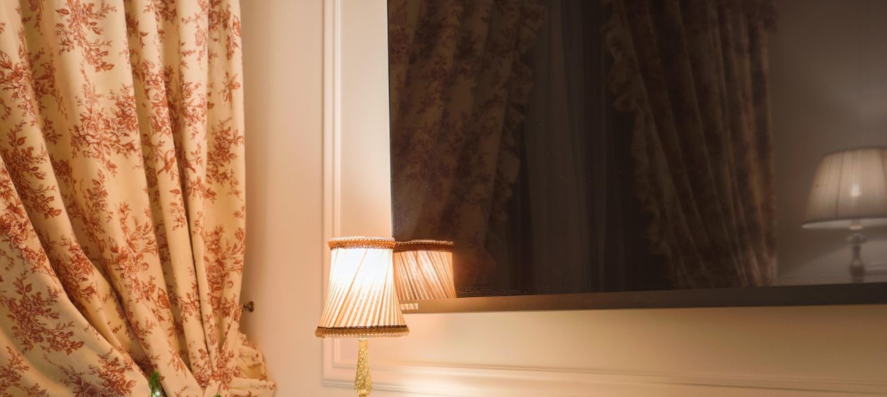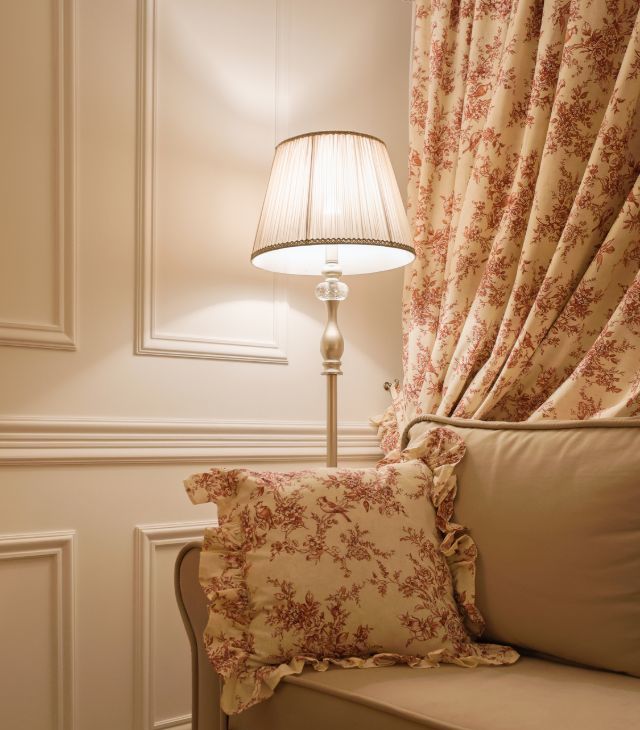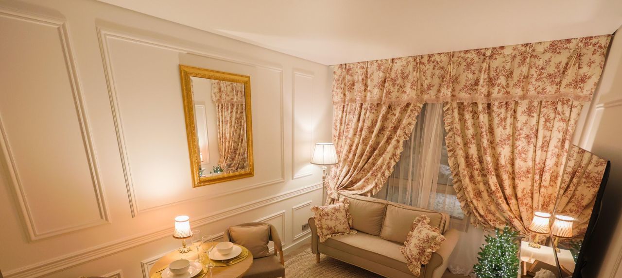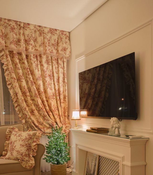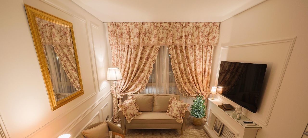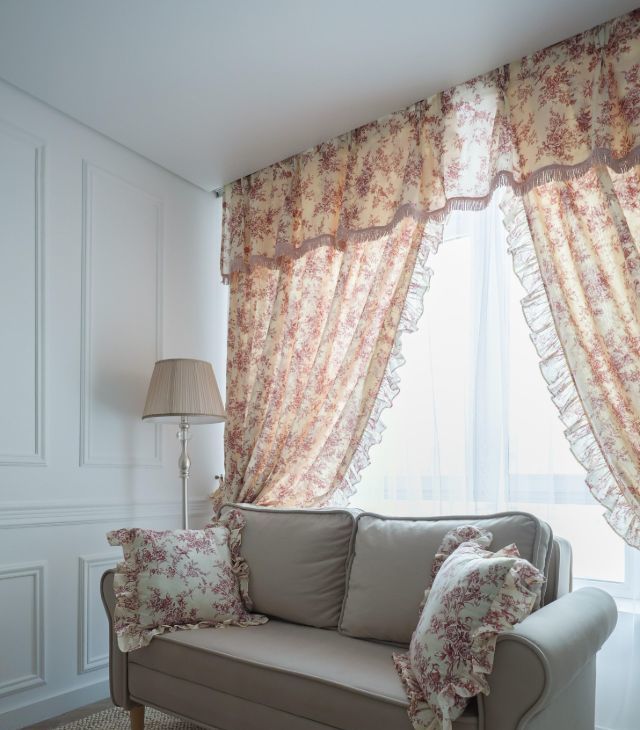 - Шторы собраны подхватами с оборками — создают эффект настоящего будуара.