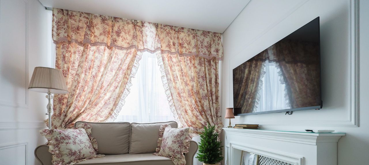 - Окно оформлено плотными шторами с цветочным орнаментом и декоративным ламбрекеном + тюль.
