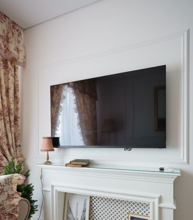 - ТВ-зона и декоративный портал: большой плоский телевизор на стене и классический белый декоративный портал под ТВ