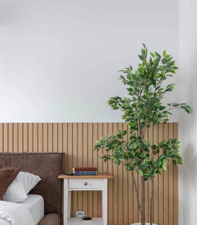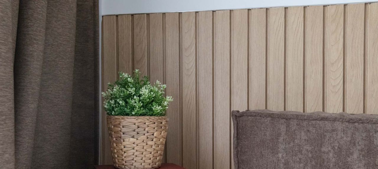 - Декоративная деревянная рейка-панель за изголовьем