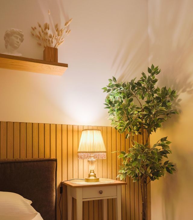 - Настольные лампы с тканевым абажуром и тёплым мягким светом