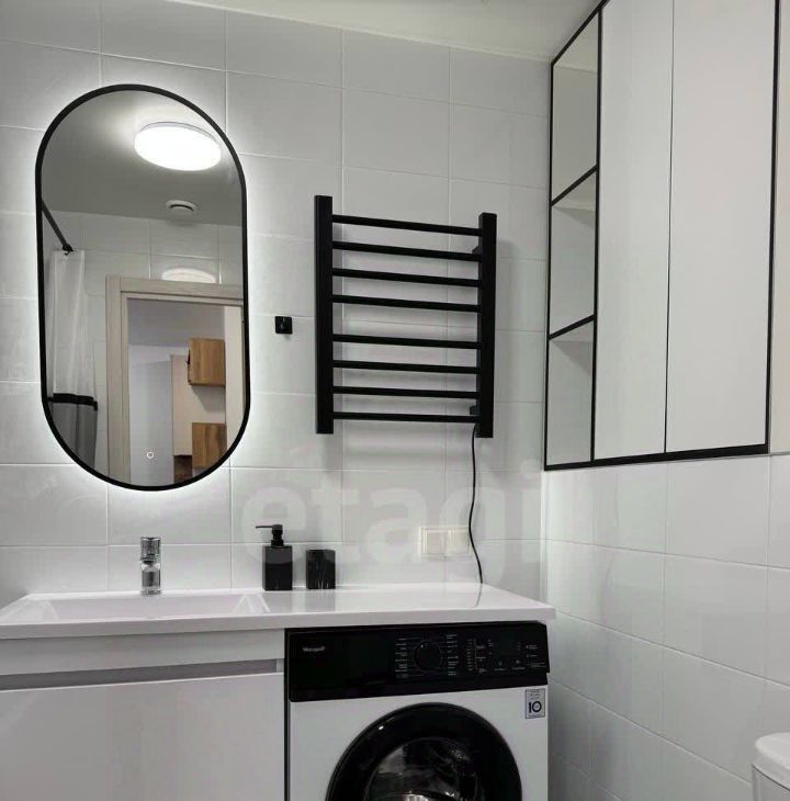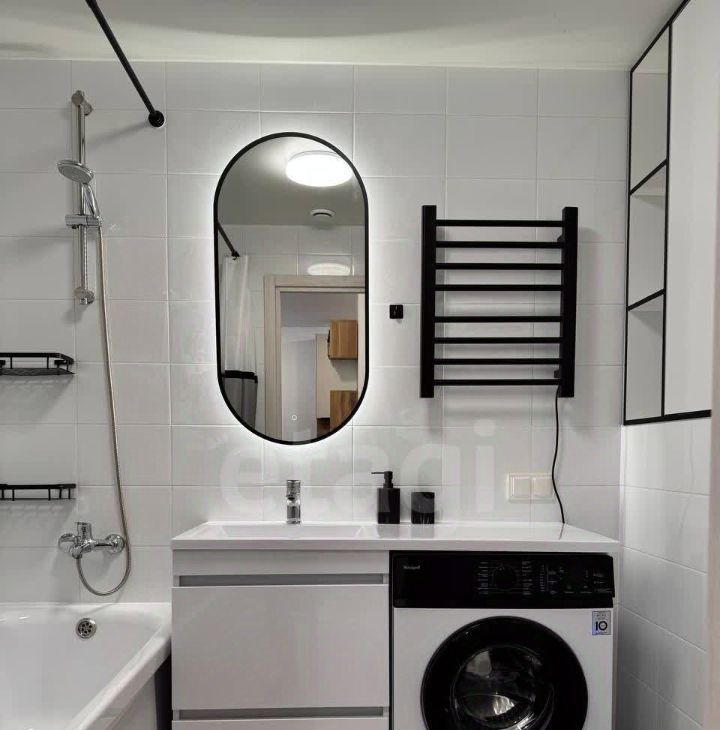 — В ванной: стиральная машина, шкаф и тумба для хранения.