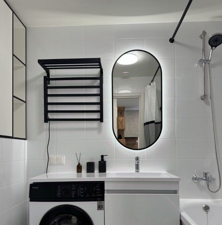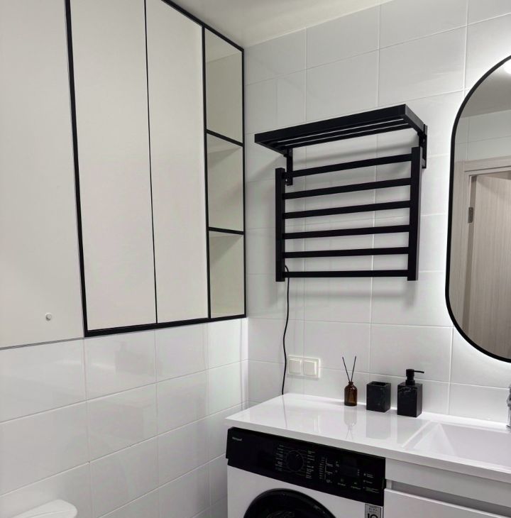 — В ванной: стиральная машина, шкаф и тумба для хранения.