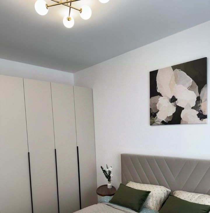 — Спальня: Установлена двуспальная кровать с орто-основанием и подъемным механизмом, матрас "Аскона". Под матрасом — глубокий короб для хранения чемоданов, зимних одеял или подушек. Рядом — вместительный распашной шкаф. Свет lamplandia, шторы blackout.