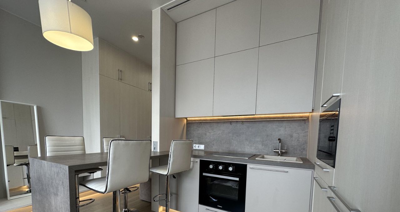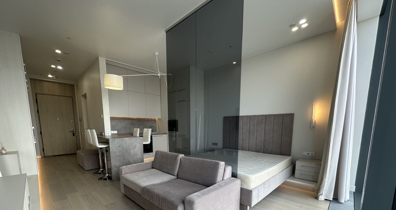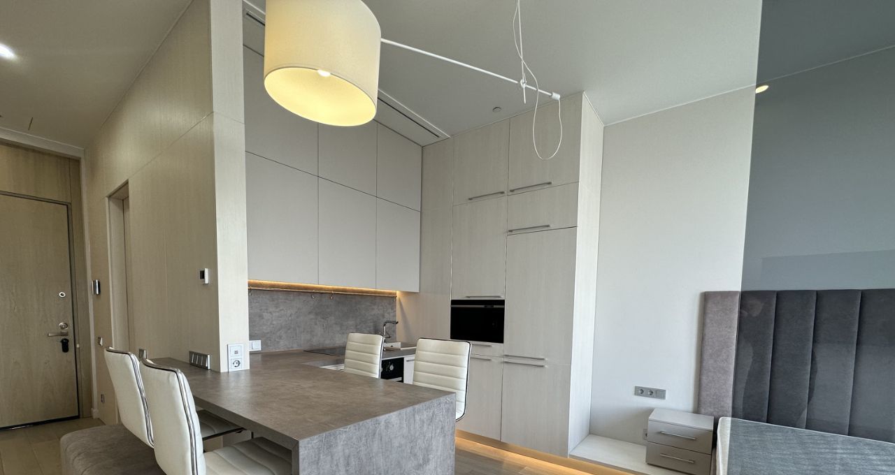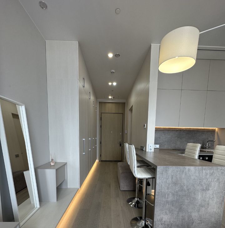 Выполнена премиальная отделка, интерьер оформлен в современном стиле в лаконичных сдержанных тонах. Апартаменты полностью укомплектованы премиальной мебелью, техникой и предметами декора.
