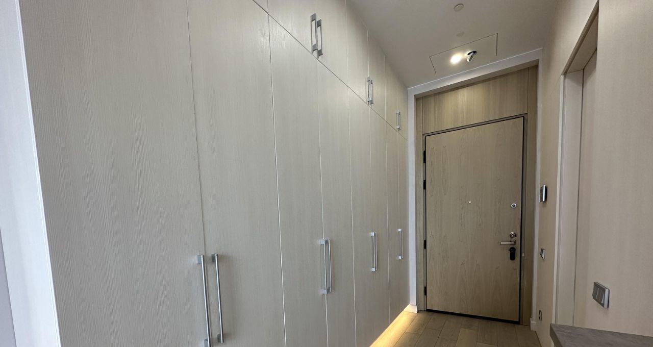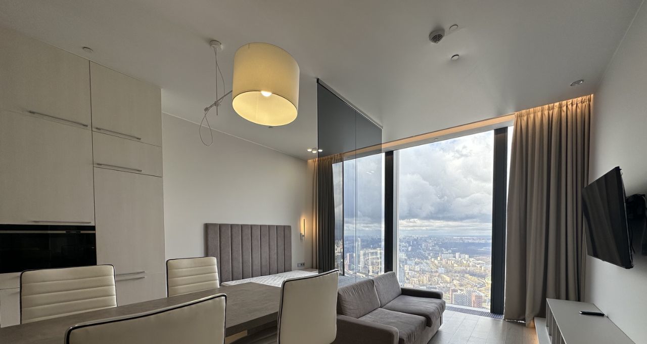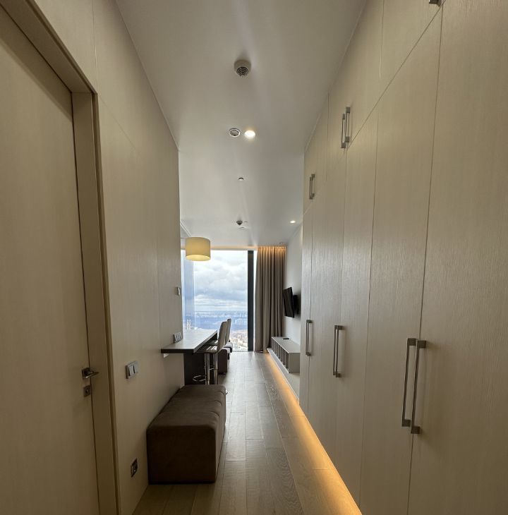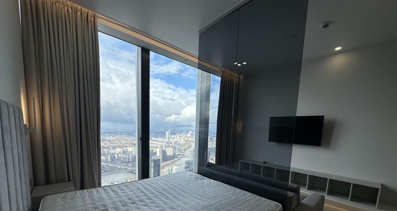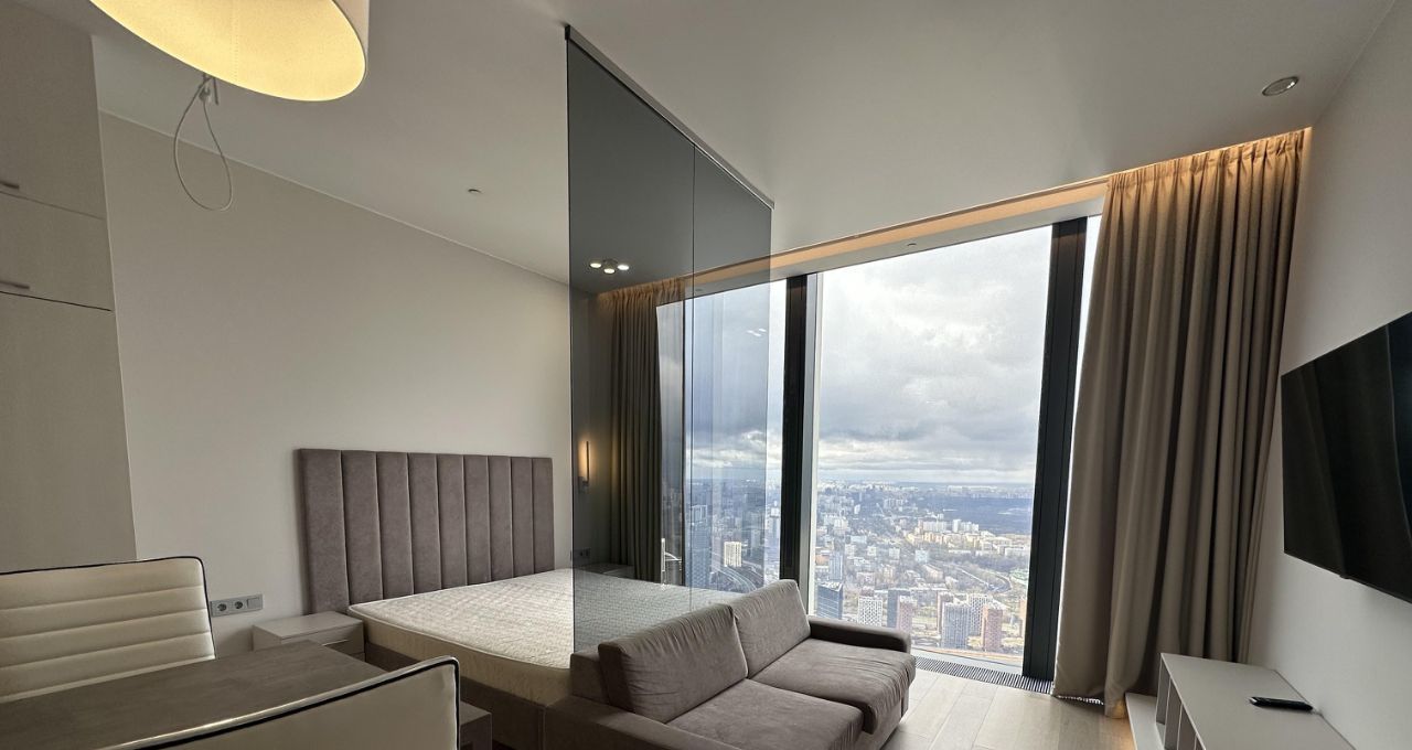 Общая площадь апартаментов — 43 кв. м, жилая — 25 кв. м. Апартаменты расположены на 62-м этаже 66-этажного дома, а из панорамных окон открывается завораживающий вид на запад столицы.