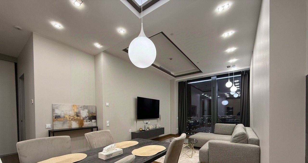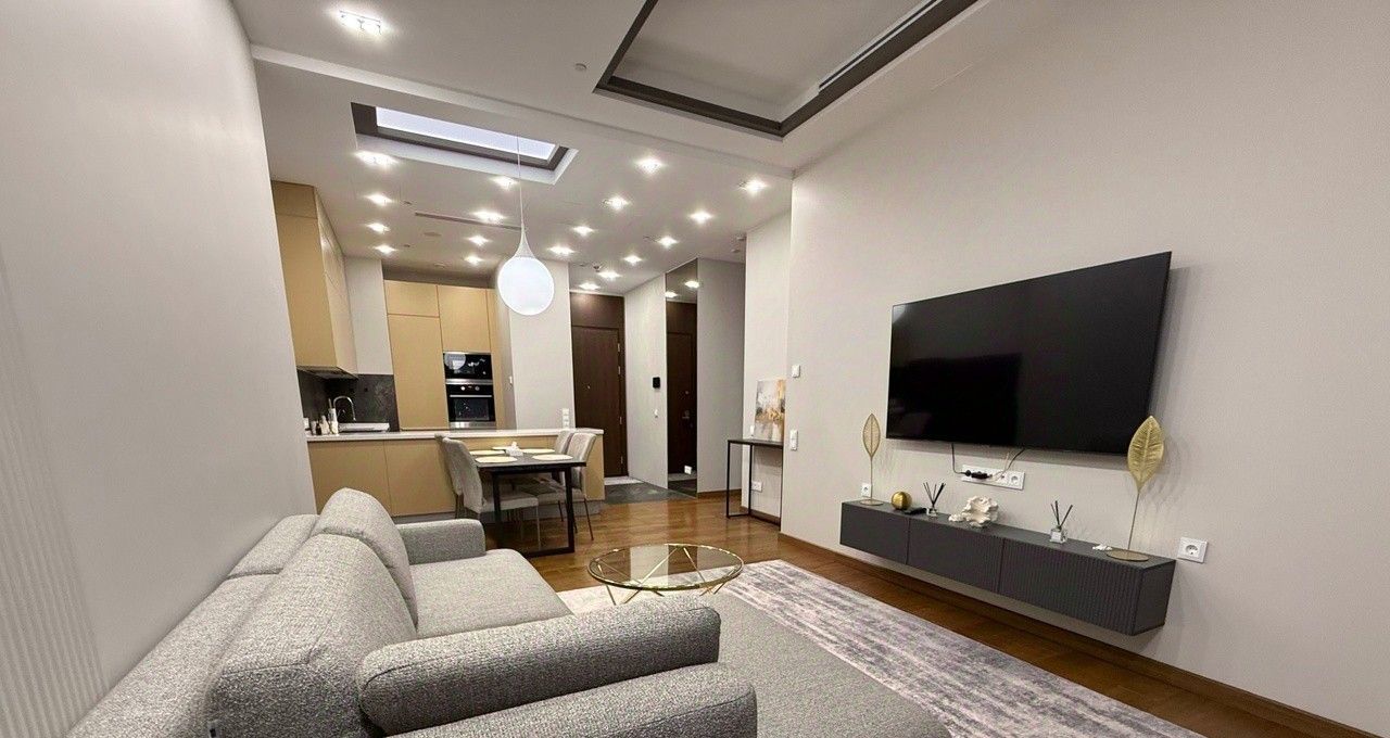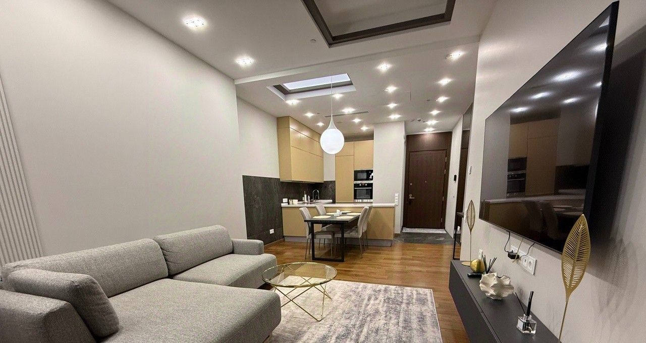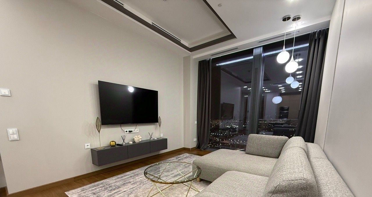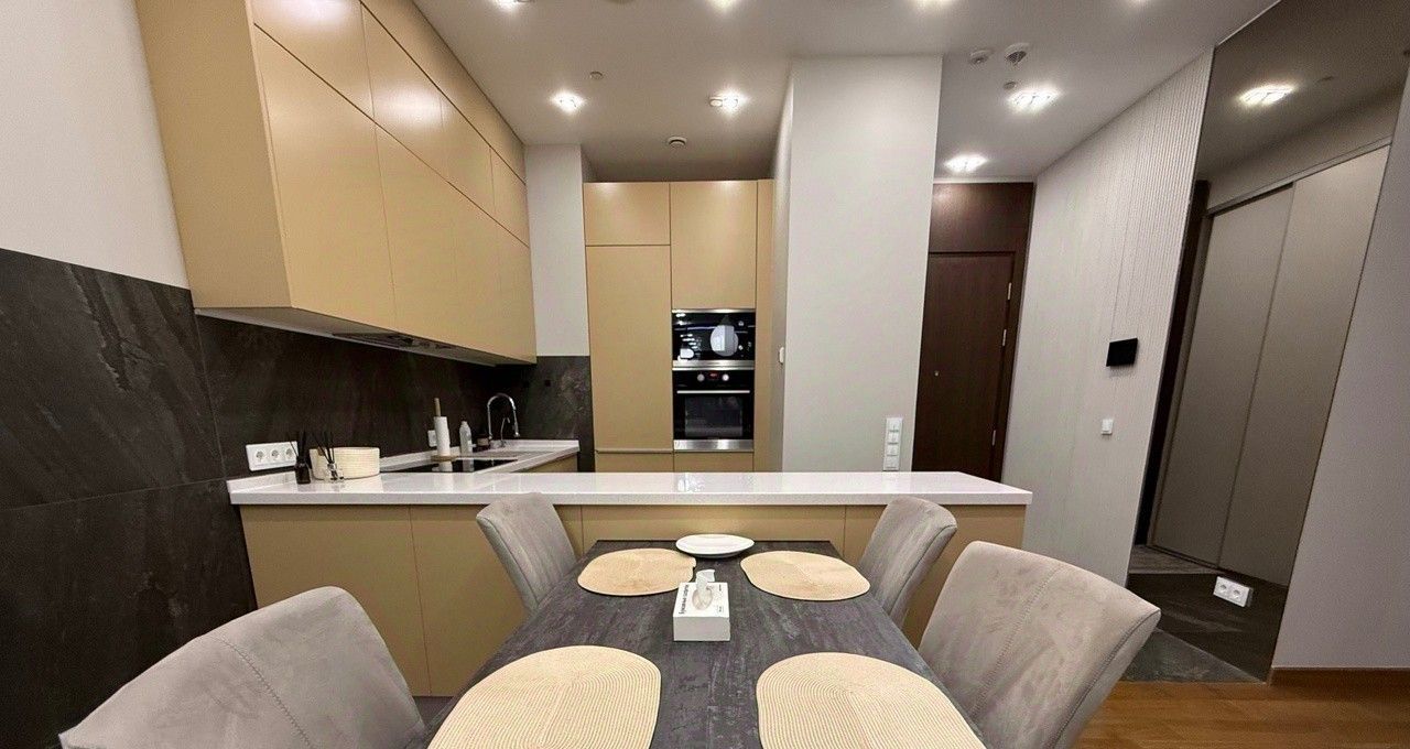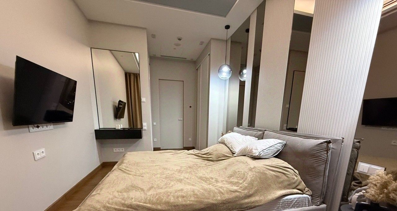 Квартира выполнена в дизайнерском стиле, что придаёт ей уникальный и современный облик. Внутри есть всё необходимое для комфортного проживания: мебель на кухне и в комнате, а также полный комплект бытовой техники. Кондиционер, холодильник, посудомоечная и стиральная машины, телевизор — всё это в вашем распоряжении.