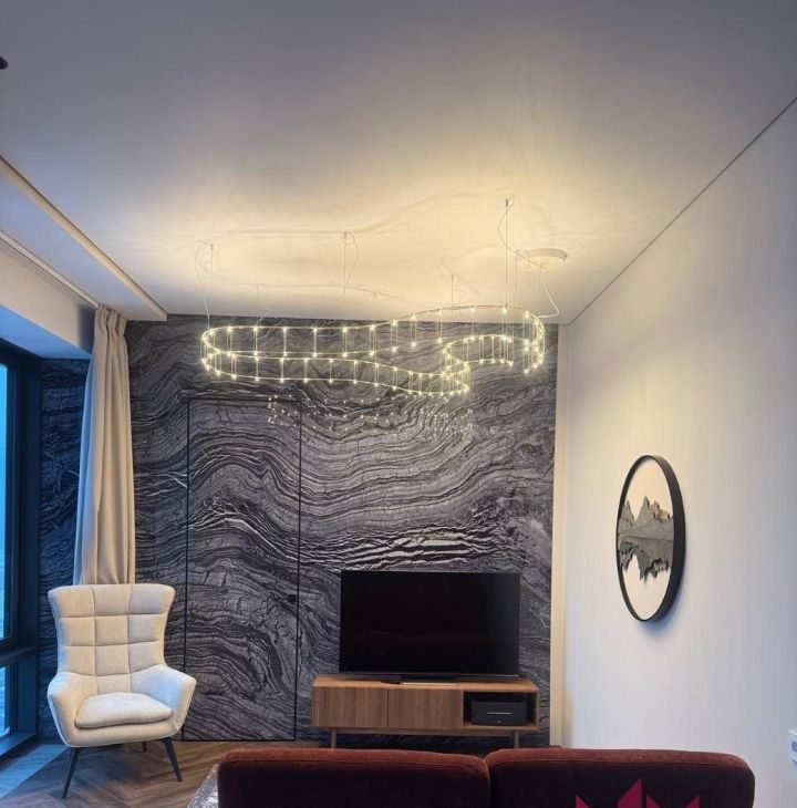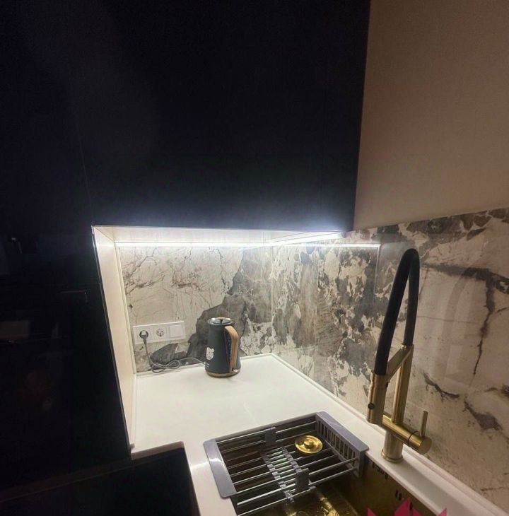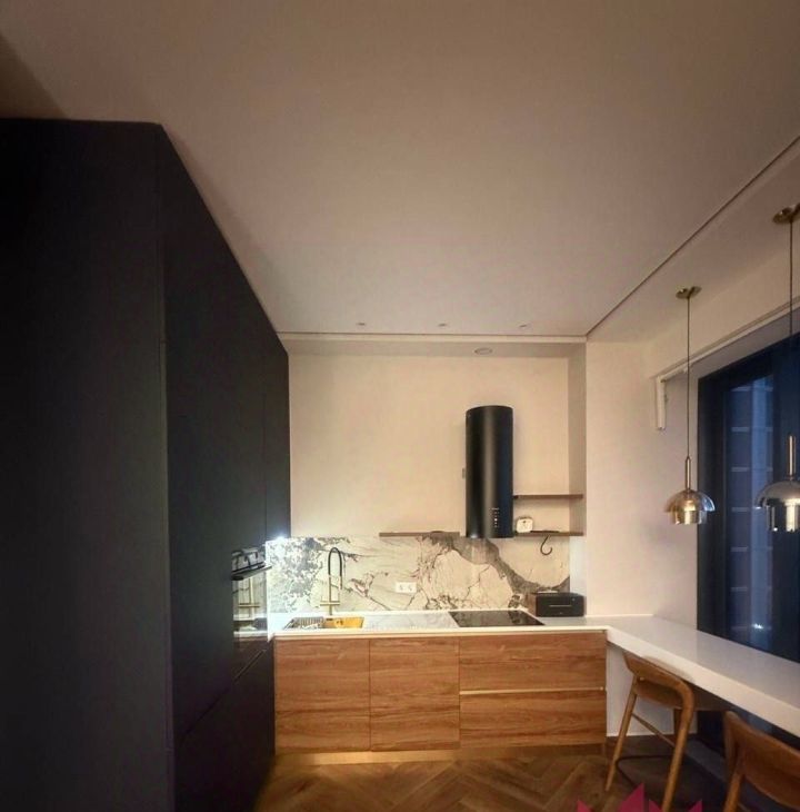 Кухня-гостиная: Современный кухонный гарнитур со встроенной техникой (посудомоечная машина, варочная панель, духовой шкаф, микроволновая печь). Установлена многофункциональная мойка с несколькими режимами подачи воды и винный шкаф. Зона отдыха оборудована мягкой мебелью и ТВ-системой.