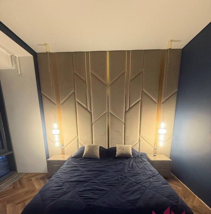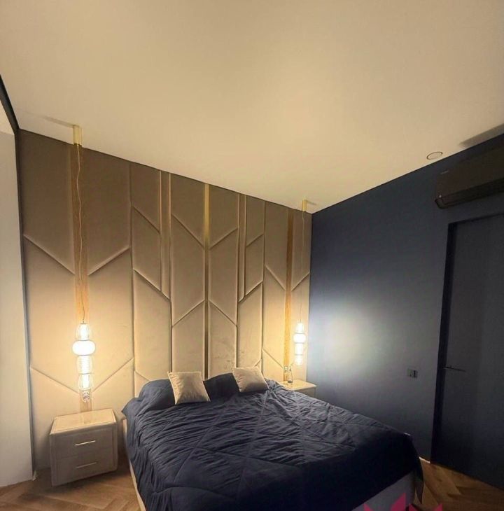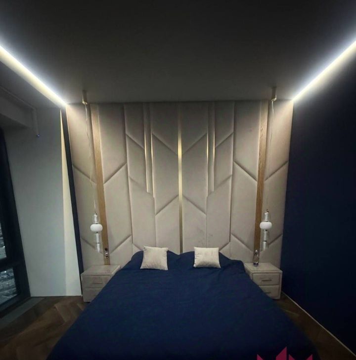 Спальня: Просторная двуспальная кровать с ортопедическим матрасом, выделенная гардеробная зона и второй телевизор.