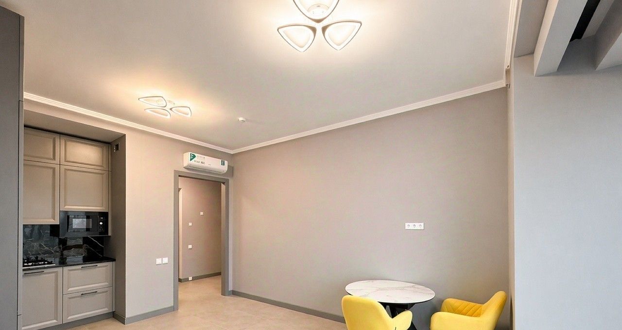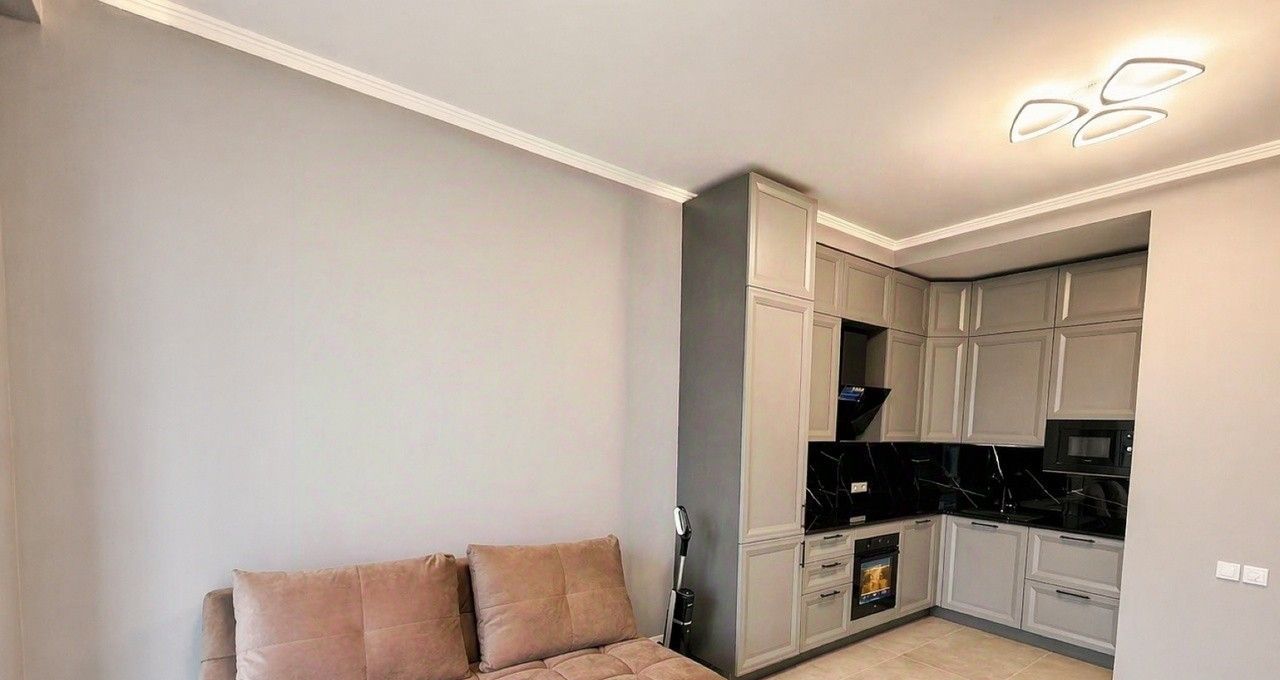 Интерьер современный и продуманный: формат евро-2 с кухней-гостиной и отдельной спальней. Квартира полностью укомплектована мебелью и техникой, подключён интернет — можно заехать и жить без дополнительных затрат.