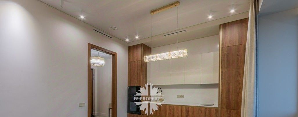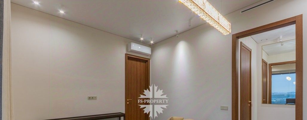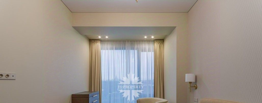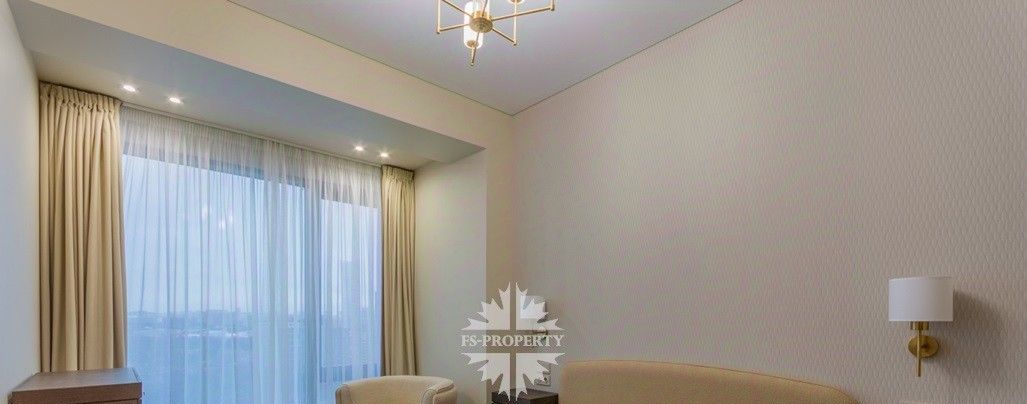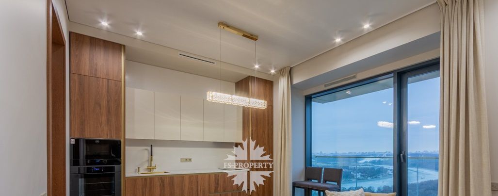 Кухнягостиная полностью меблирована и оснащена техникой премиумкласса; из гостиной — выход на лоджию с видом на город и набережную.