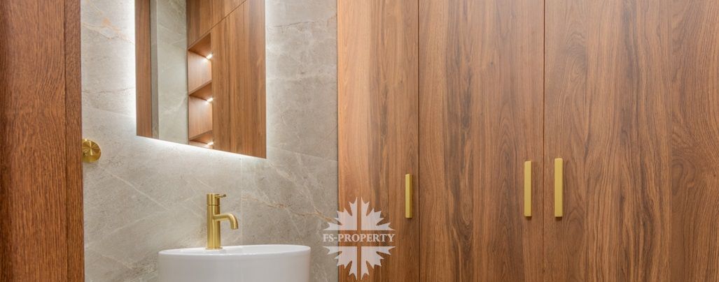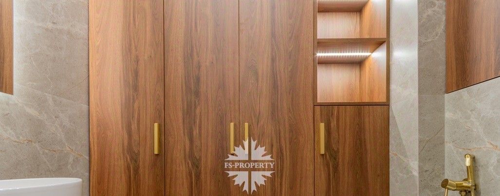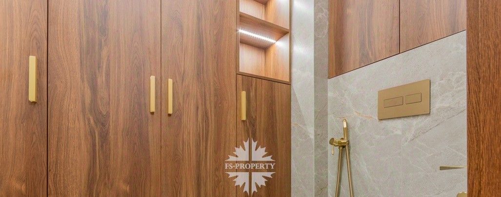 Прихожая с вместительными встроенными шкафами; в гостевом санузле — встроенный шкаф для хозяйственных принадлежностей; стиральная и сушильная машина встроены.