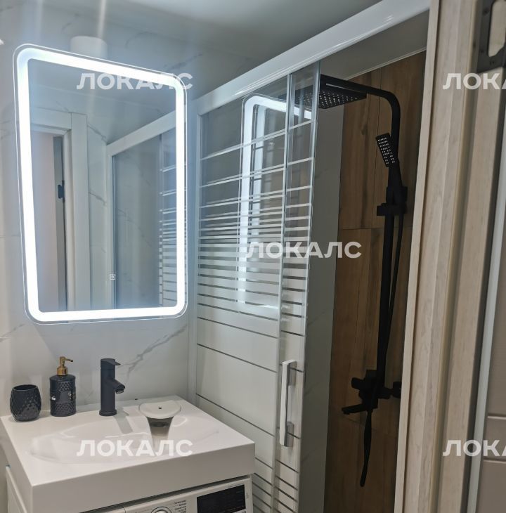 Санузел с душевой, стиральной машиной, зеркалом с подсветкой.