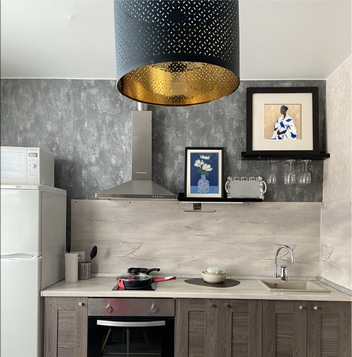 Проведен интернет. Техника: кондиционер, холодильник, плита с 2 конфорками, духовка, микроволновая печь. Набор посуды.