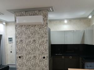Просторный санузел с душевой кабиной. В ванной комнате установлена стиральная машина. Квартира оснащена кондиционером.