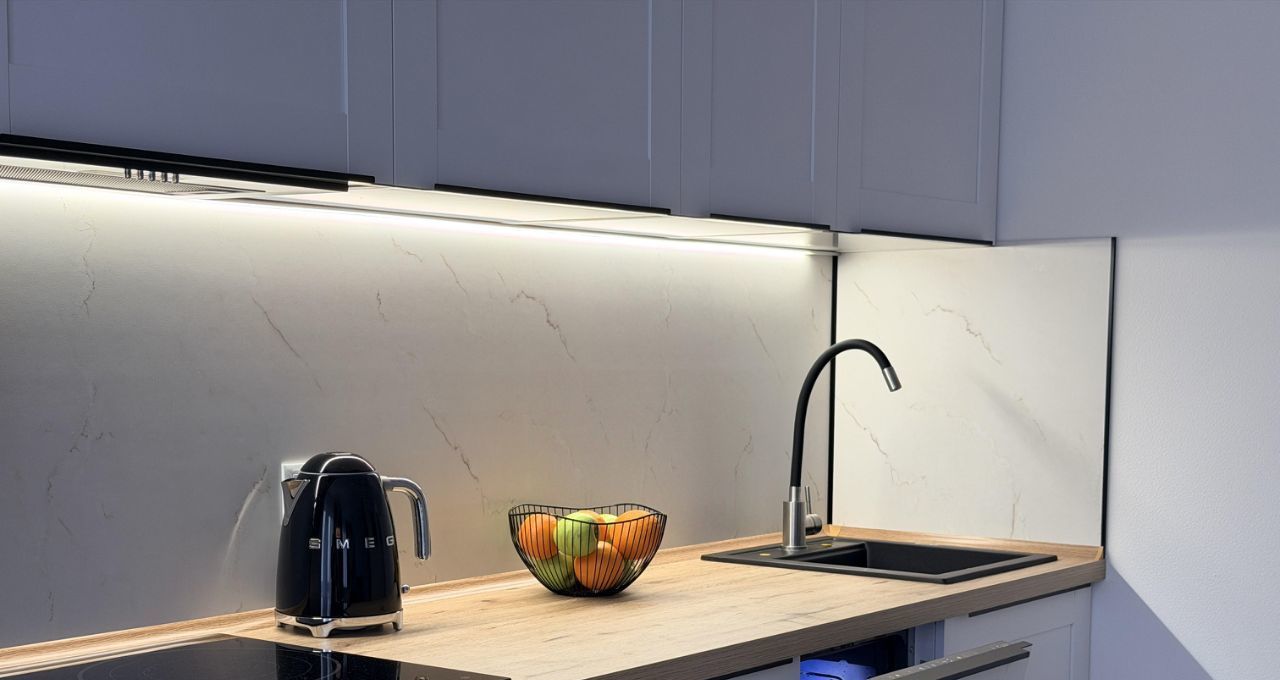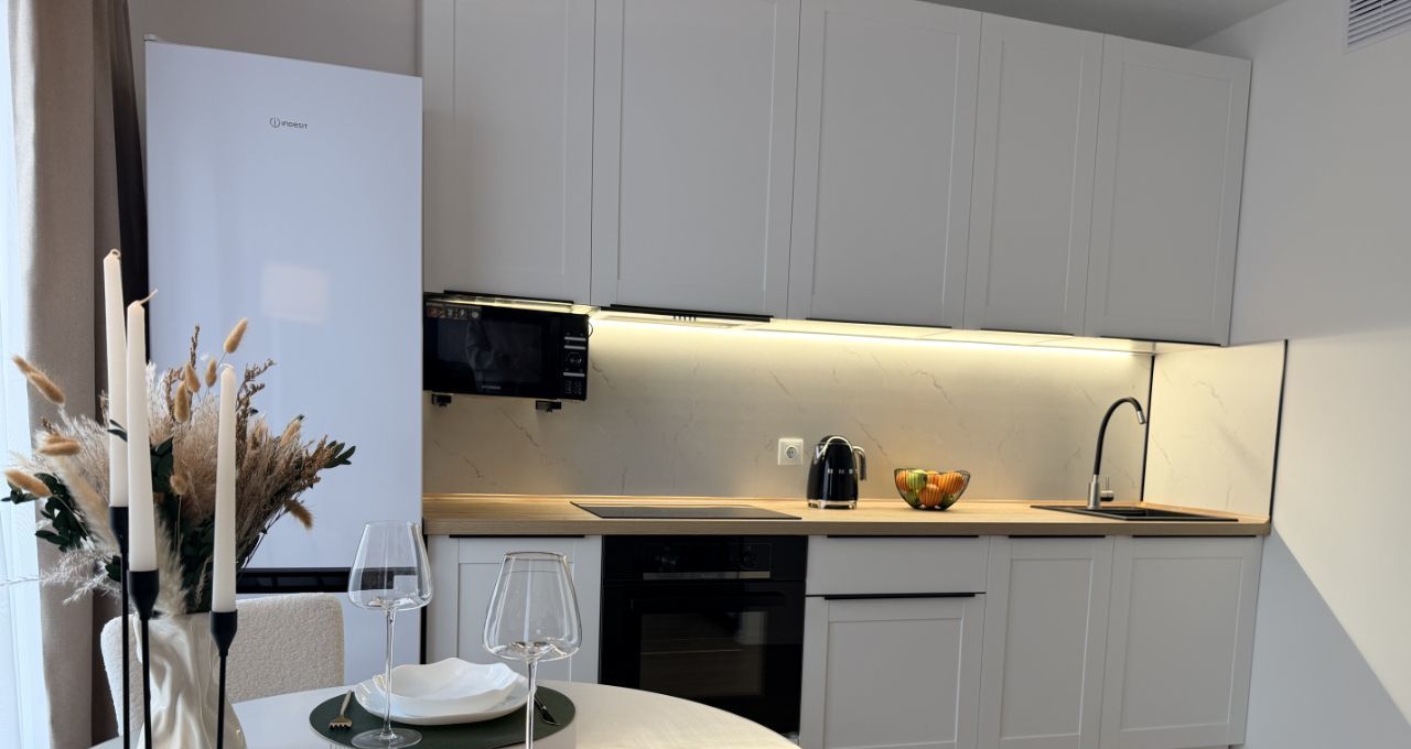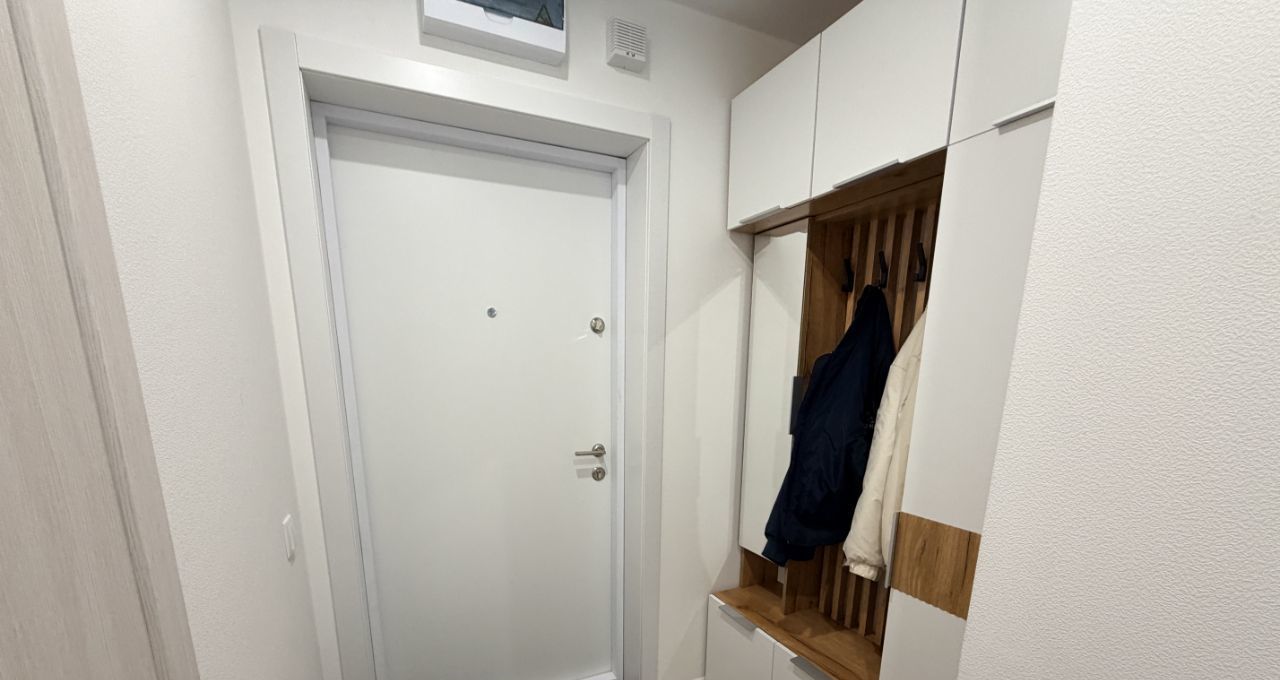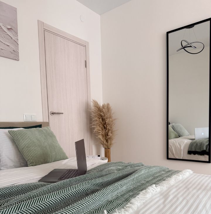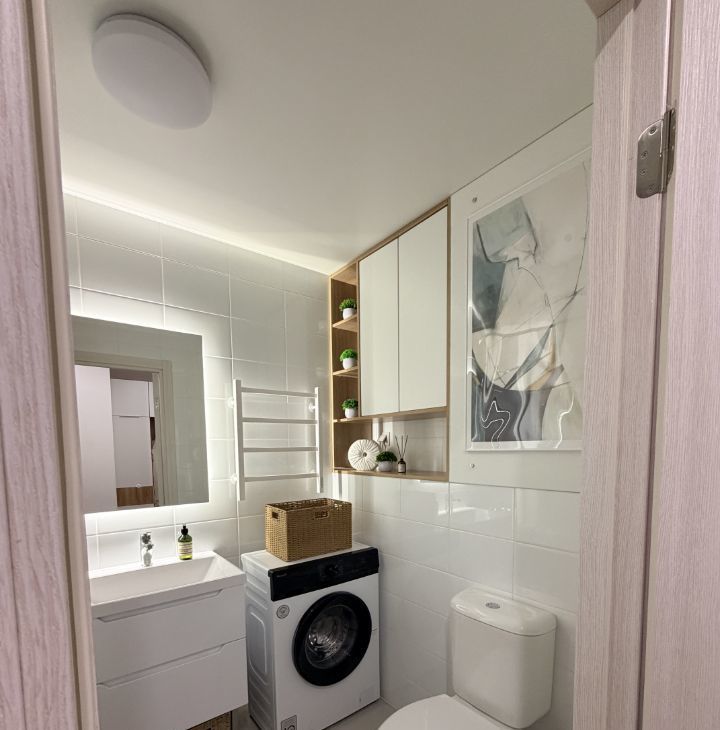 Квартира выполнена в стильной дизайнерской концепции: сочетание дерева, белых и чёрных оттенков с зелёными акцентами, что создает тёплую и уютную атмосферу. Идеально подойдёт для тех, кто ценит эстетику и комфорт.