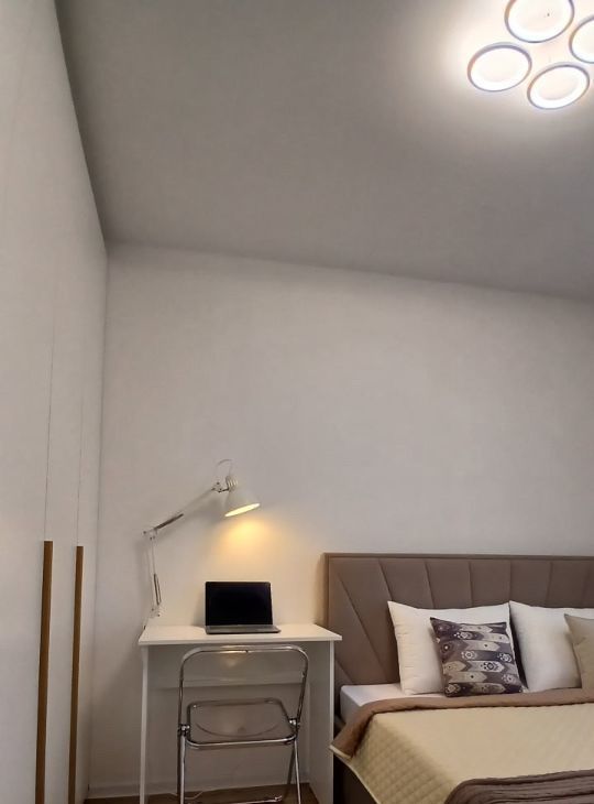 Для работы из дома имеется рабочий стол с настольной лампой в спальне. При желании, его можно легко разобрать и убрать вместе со складным стулом в кровать.