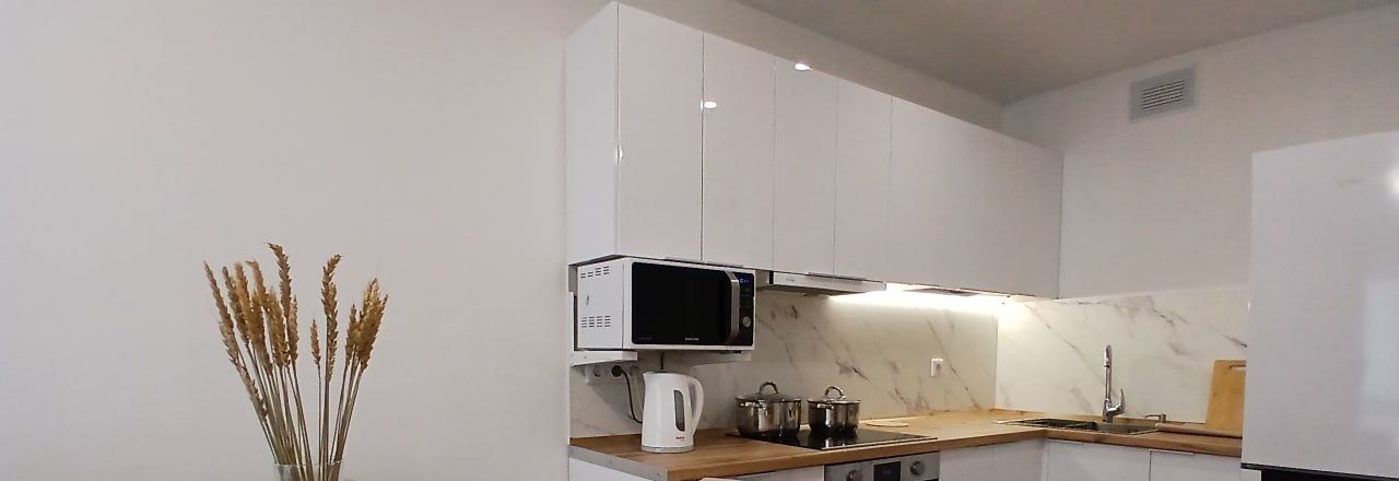 Кастрюли/ сковородки, посуда, приборы, постельное белье, подушки и одеяла, роутер(интернет уже проведен и работает). Вся необходимая техника (4х конфорочная индукционная плита с посудой), духовой шкаф, микроволновая печь, холодильник, SMART-TV 4k 43 дюйма, стиральная машина), мебель. Кровать с удобным ортопедическим матрасом ASKONA.