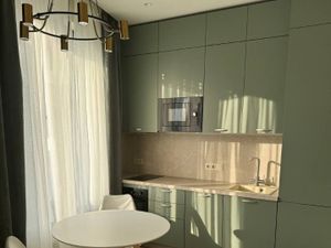 В квартире есть всё необходимое для комфортного проживания. Дизайнерский ремонт создаст уютную атмосферу. В кухне и комнате установлена современная мебель, а также вся необходимая техника фирмы Bosh: кондиционер, холодильник, посудомоечная машина, телевизор и стиральная машина.
