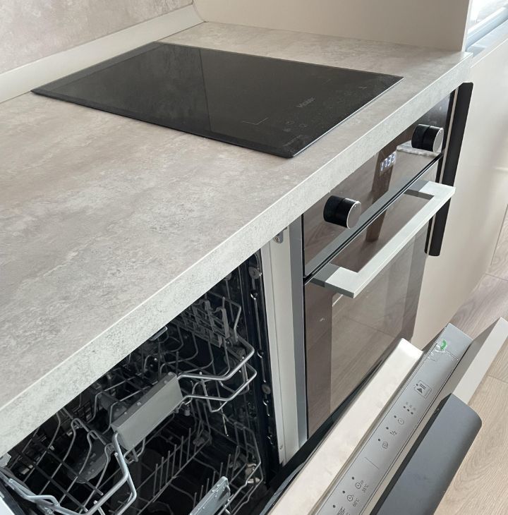 Кухня: Полный комплект встроенной техники — посудомоечная машина, духовой шкаф, большой двухкамерный холодильник, микроволновка, варочная панель и электрический чайник.