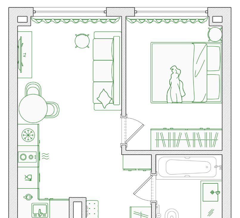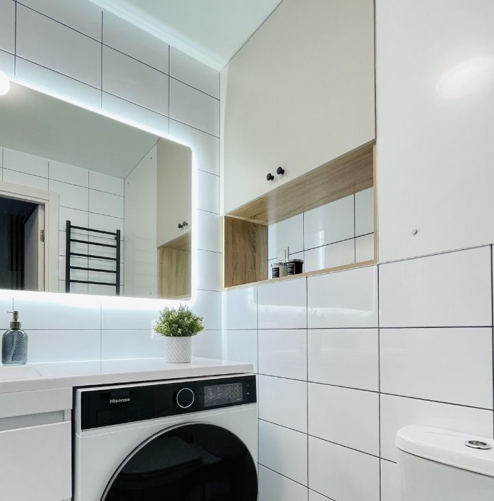Санузел: Совмещенный, с ванной, стиральной машиной. Дополнительно организованы места для хранения: тумба под раковиной и шкаф в нише.