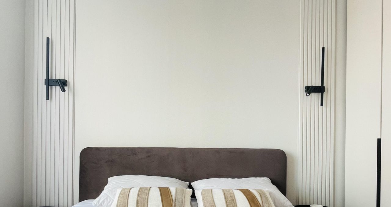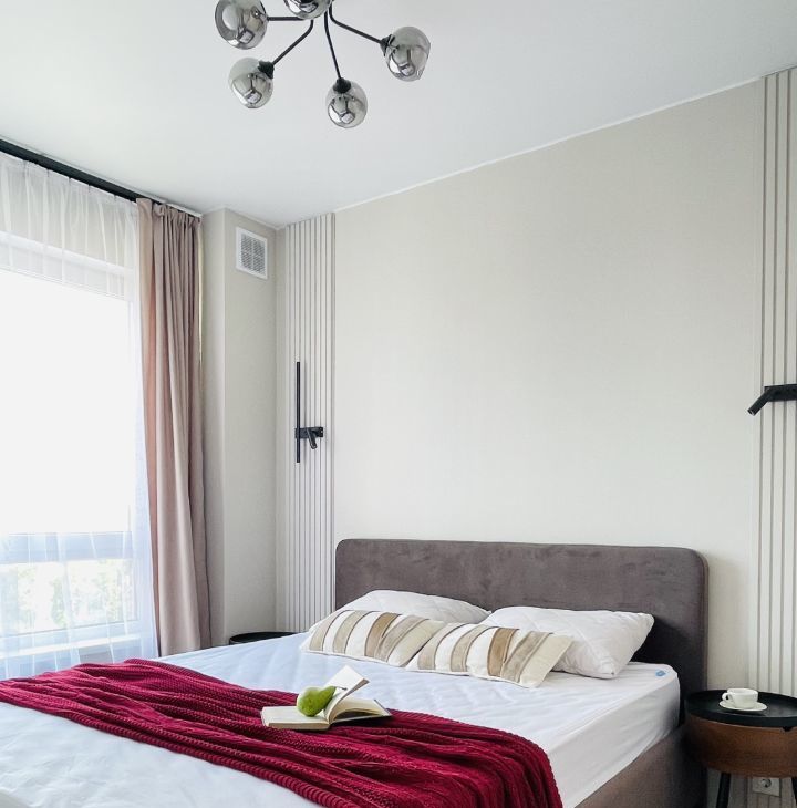 Спальня: Двуспальная кровать с ортопедическим матрасом (шириной 160 см) и подъемным механизмом для дополнительного хранения.
