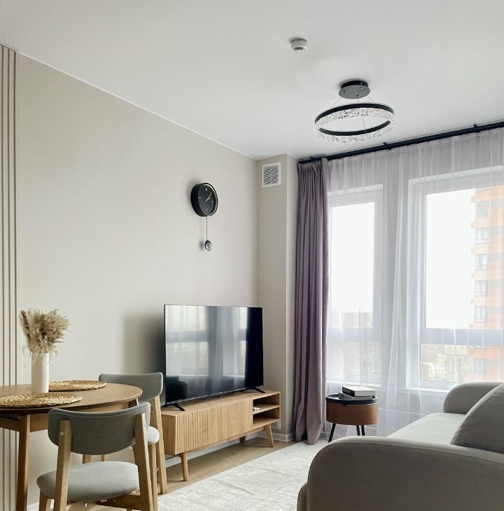 Гостиная: Удобный раскладной диван и большой телевизор со Smart TV.