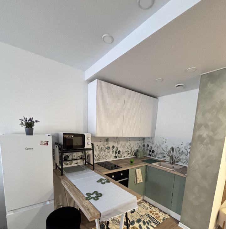 2. Кухня-гостиная- раскладной диван, торшер, телевизор, тумба под ТВ, журнальный столик, чайник, индукционная плита, микроволновая печь, духовой шкаф.
