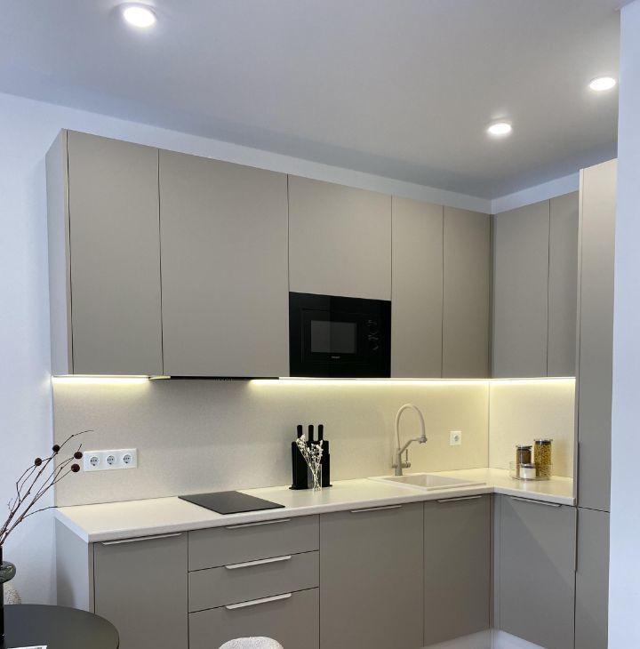 Вся техника встроенная. Вместительный холодильник, посудомоечная машина 45 см, стирально-сушильная машина, СВЧ-печь.