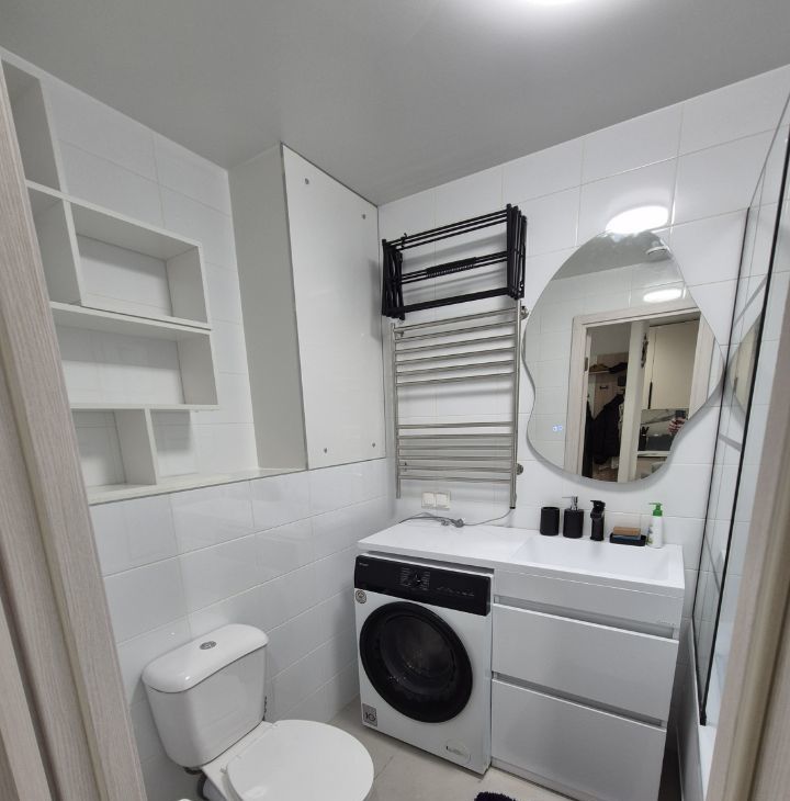В ванной установлена стиральная машина с функцией сушки (2 в 1), современная сантехника и удобная система хранения. Все аккуратно, функционально и в едином стиле.