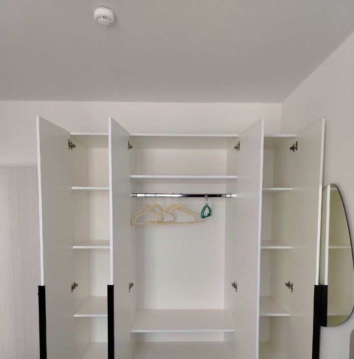 В спальне — большая кровать с ортопедическим матрасом, обеспечивающим качественный сон. Вместительный шкаф с большим количеством полок и отделений позволяет удобно организовать хранение одежды и личных вещей.