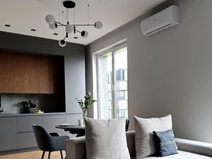 Всё продумано до мелочей для вашего комфорта. Дизайнерский ремонт в серо-голубых тонах, качественная чистовая отделка (камень, шпон), новые батареи, хорошая мебель, текстиль и техника.