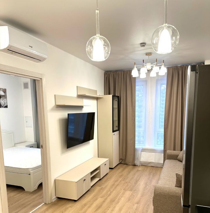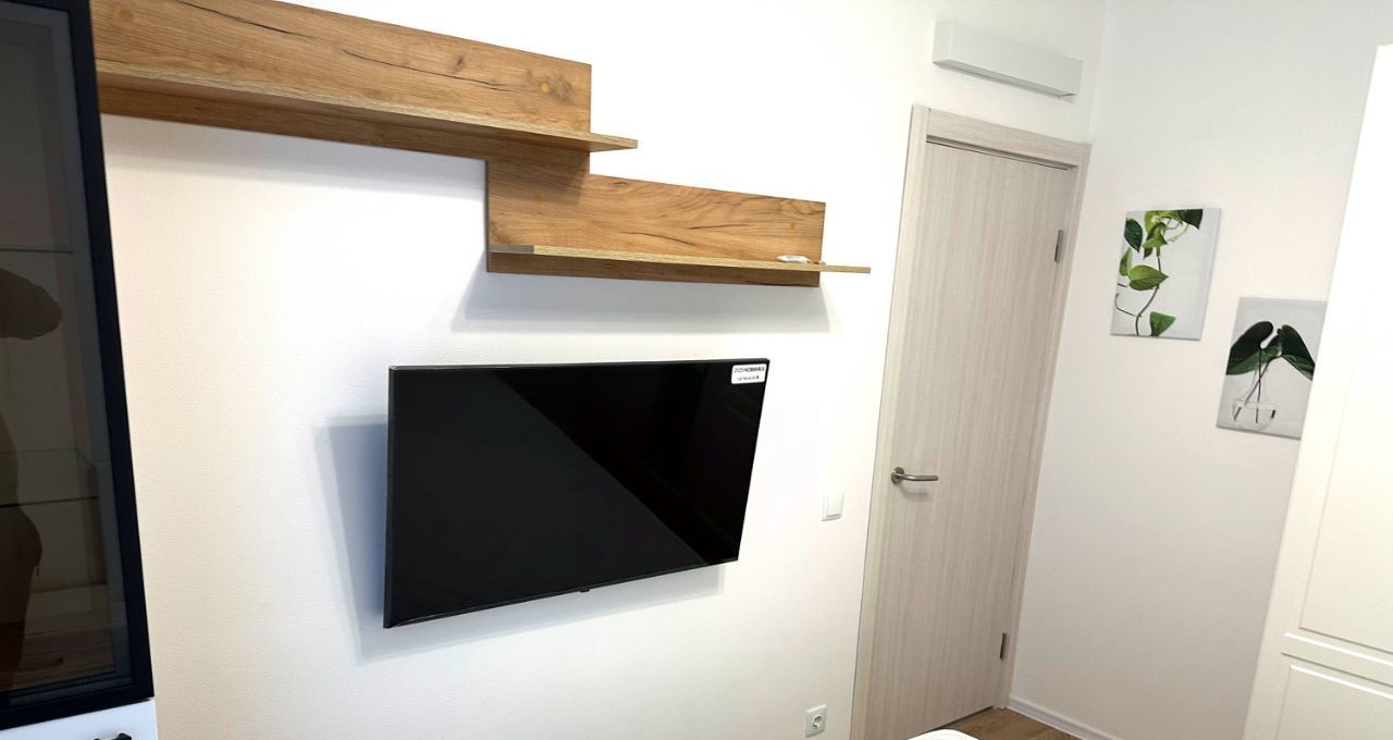 Гостиная: диван с зоной хранения, телевизионная стенка, телевизор 50 дюймов, инверторная сплит-система.