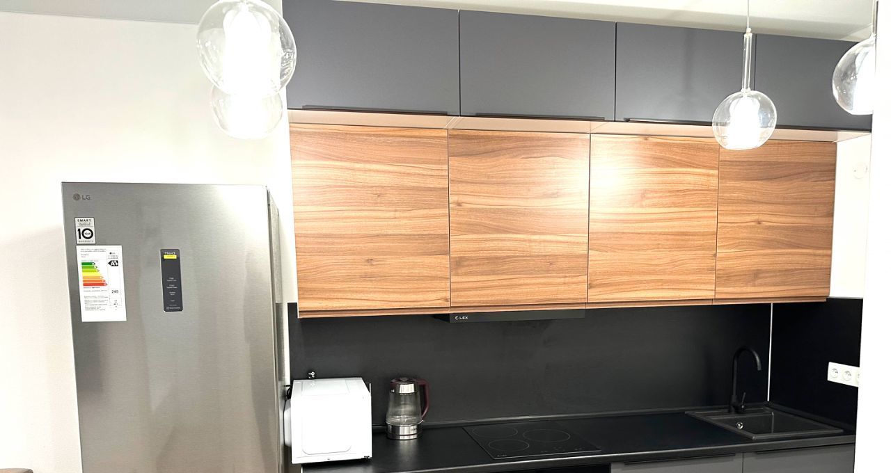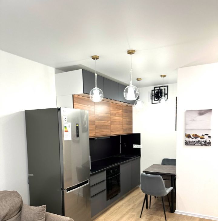 Кухня: комфортный кухонный гарнитур в 3 яруса, варочная панель, духовой шкаф, вытяжка, холодильник, микроволновка, посудомоечная машина, чайник, стол, стулья.