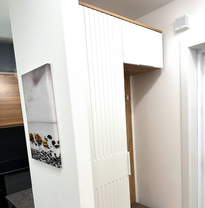 Прихожая: шкаф, зона хранения, пылесос, утюг, гладильная и сушильная доски.
