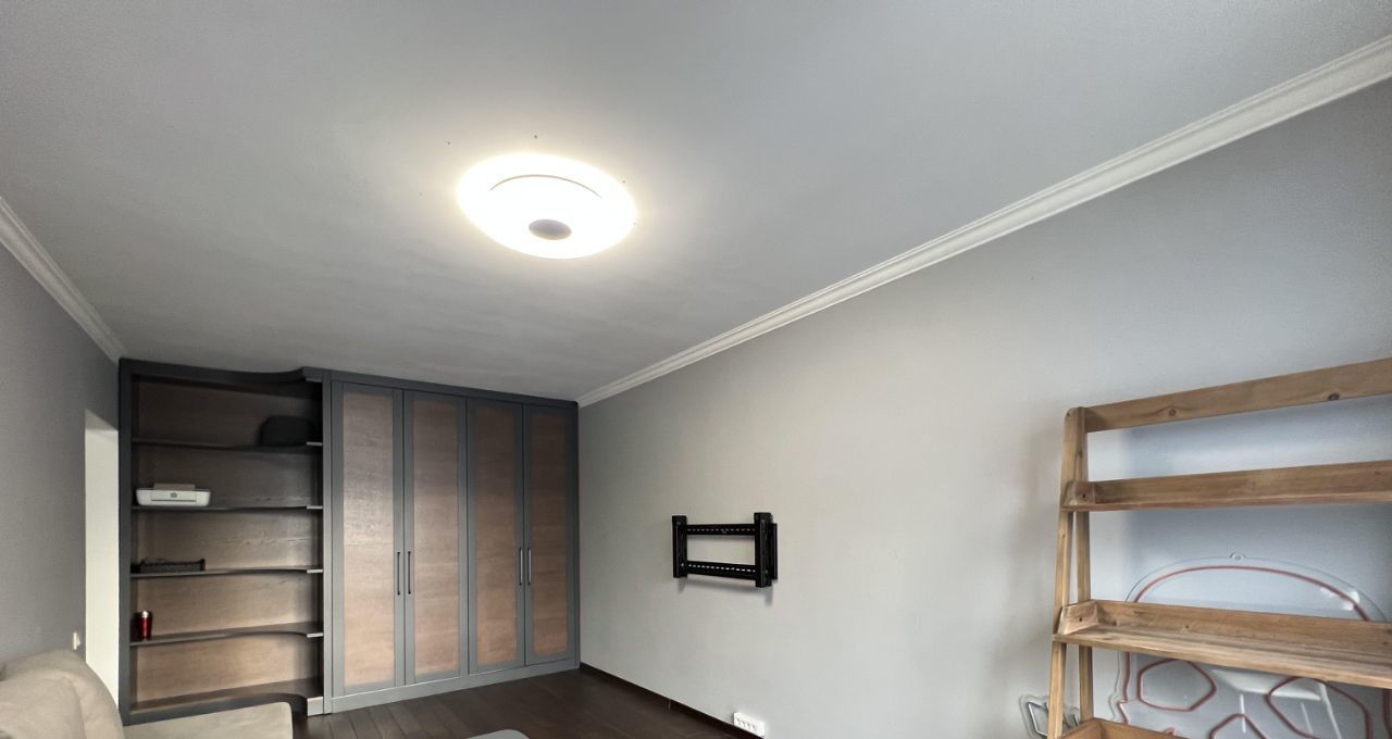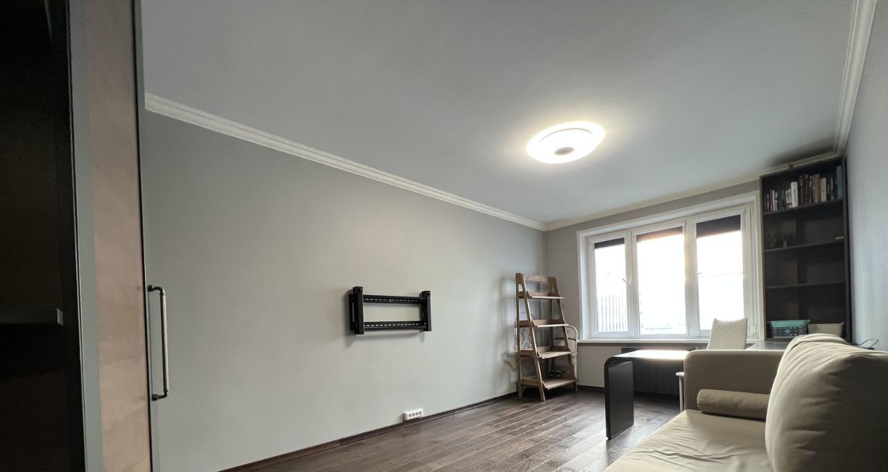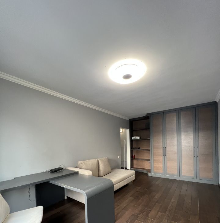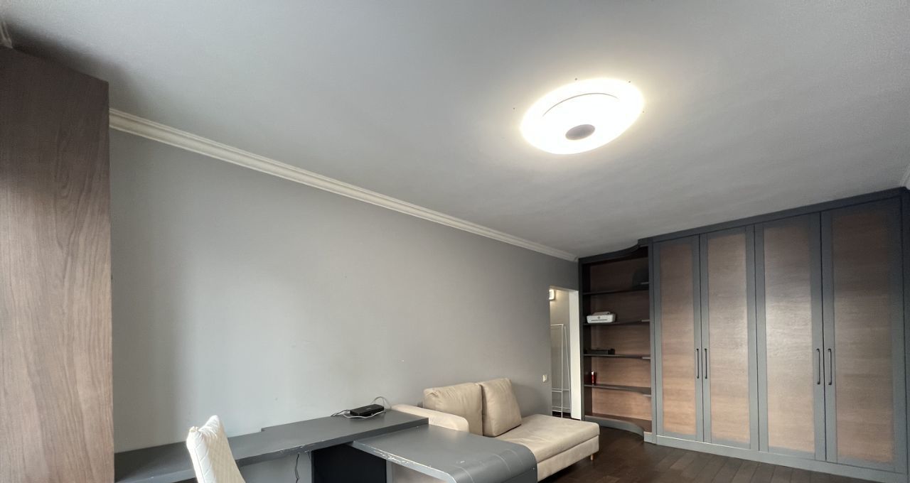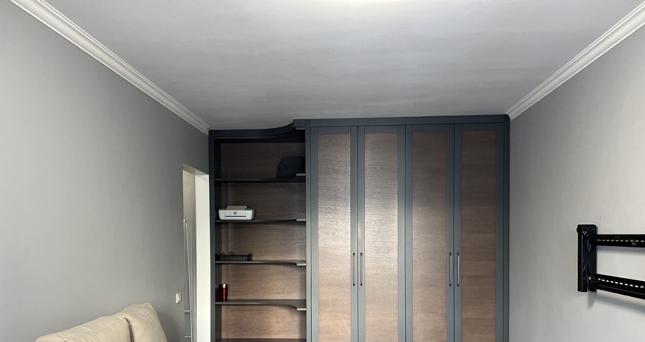 Полностью меблирована: встроенные шкафы в коридоре и гостиной, диван, компьютерный и кухонный столы, стулья, кронштейн под телевизор.