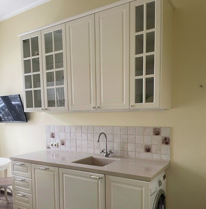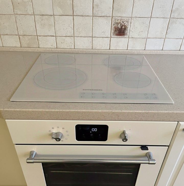 Есть вся необходимая мебель и техника: плита, духовой шкаф, вытяжка, посудомоечная машина, холодильник, телевизор, стиральная машина.