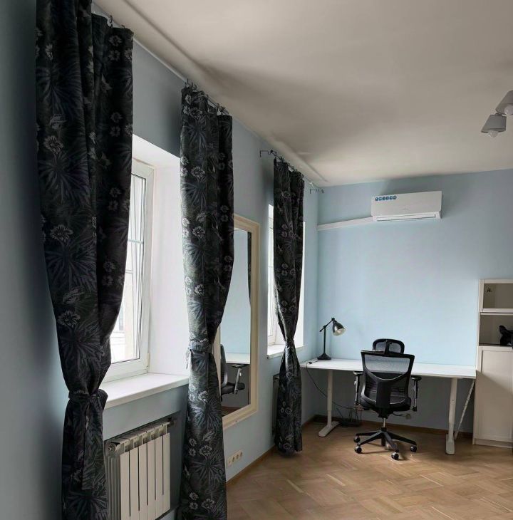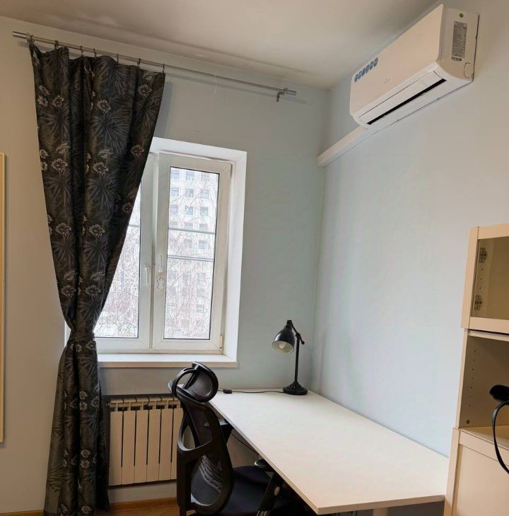 Квартира в отличном состоянии, очень светлая (пятый этаж, в комнате два окна, на кухне изящный балкончик). В комнате установлен кондиционер (сплит система).