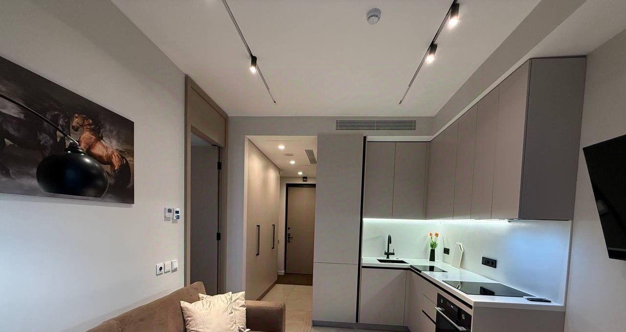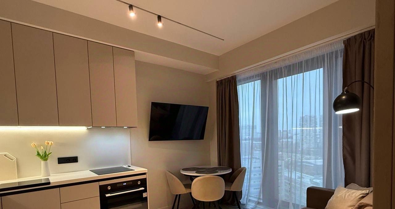 Компактная, грамотно спланированная квартира площадью 32,1 м² с панорамными окнами и высотой потолков 3 метра.
