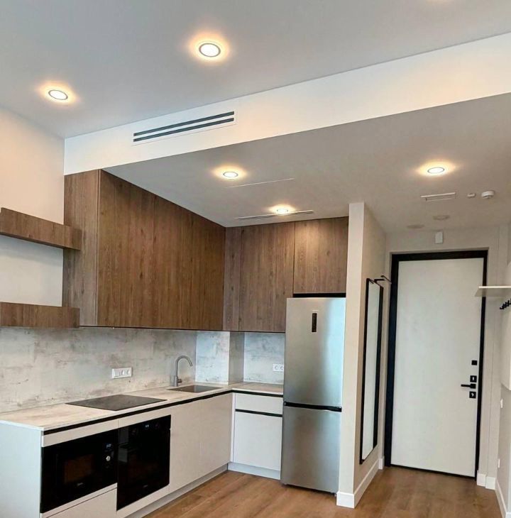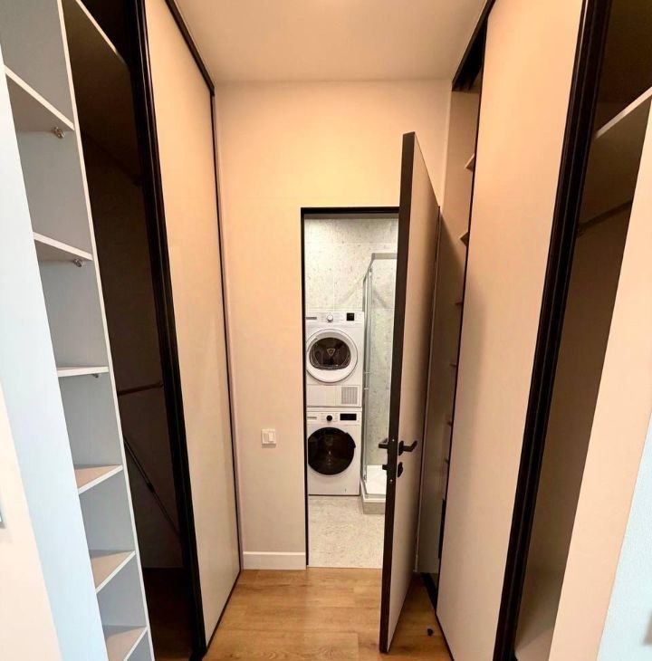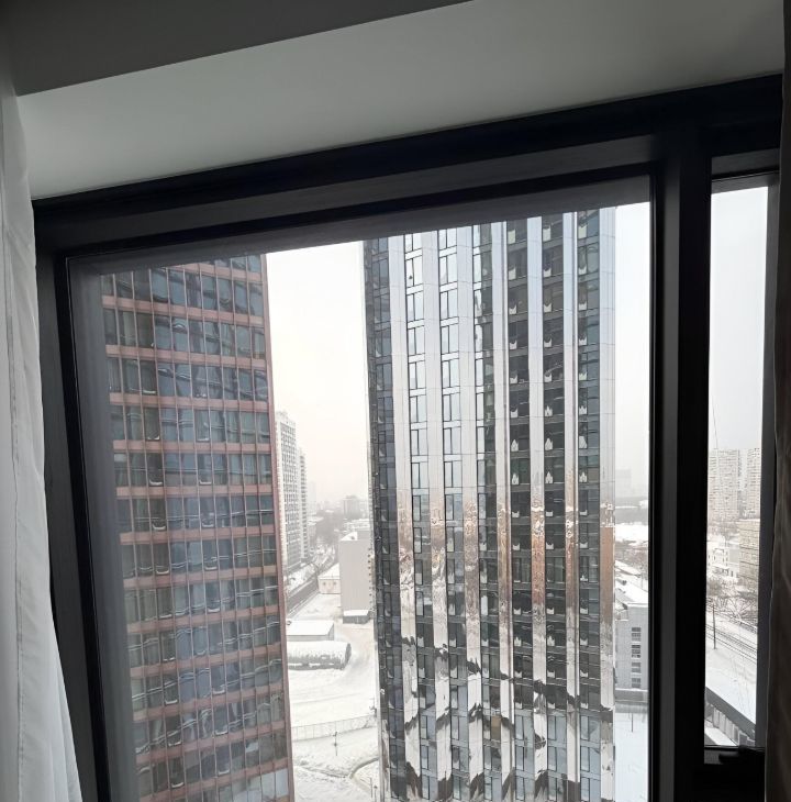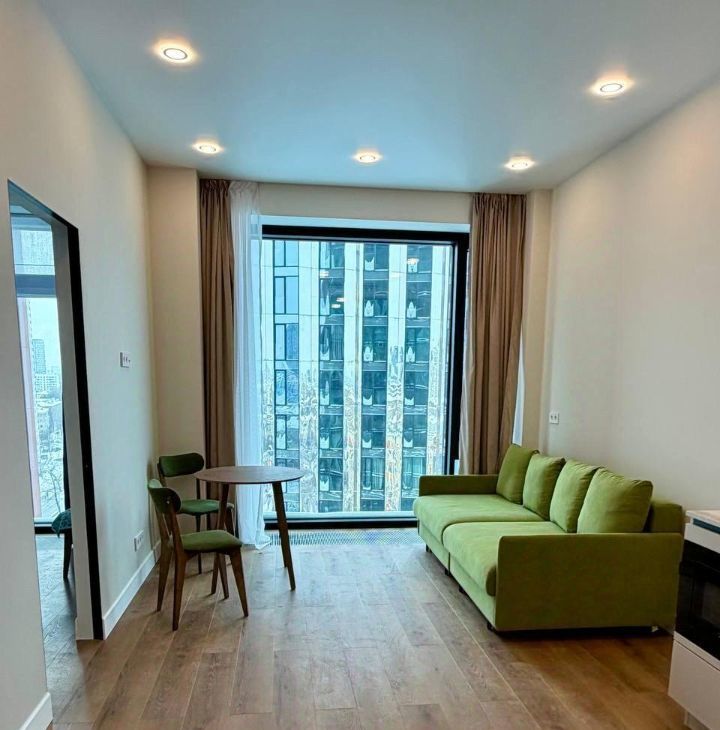 Общая площадь квартиры составляет 38 кв. м, расположена на 13-м этаже 53-этажного дома. Высокие потолки и окна в пол создают ощущение простора и свободы.