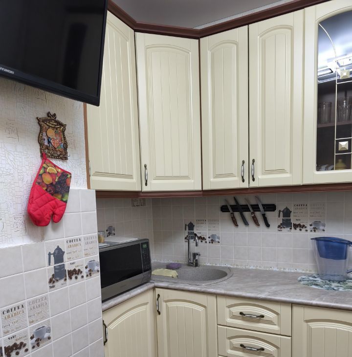 В кухне кухонная мебель, плита, холодильник, СВЧ , телевизор, кухонный стол, стулья. В комнате угловой диван-кровать, шкафы, кондиционер, телевизор. Застекленная большая лоджия на кухне. Кладовка.