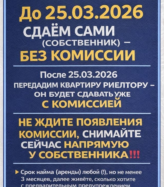 БЕЗ КОМИССИИ (!) При несдаче до 25.03.2026 квартира будет передана риелтору и появится риелт.комиссия - не ждите, снимайте сейчас НАПРЯМУЮ У СОБСТВЕННИКА!!!