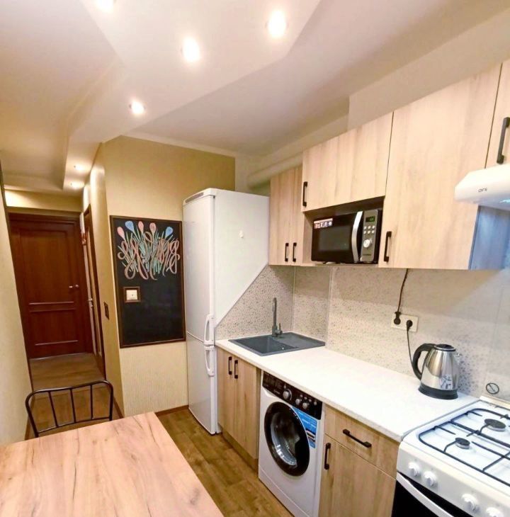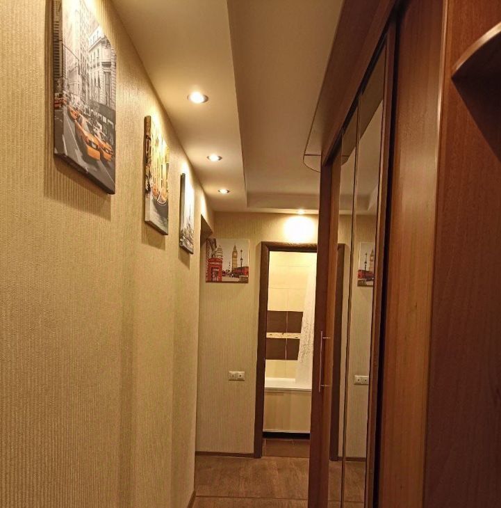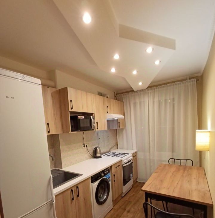 Квартира очень чистая, теплая, после ремонта. Стеклопакеты. В коридоре шкаф-купе. В комнате кровать двуспальная 180х200, шкаф купе,, ЖК телевизор, кондиционер, интернет. На кухне холодильник, стиральная машина, плита, микроволновка.