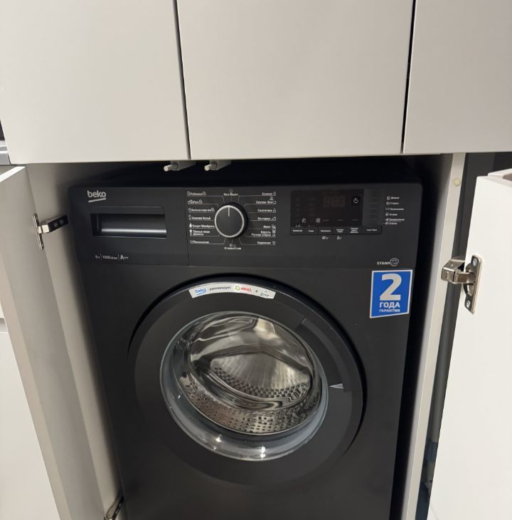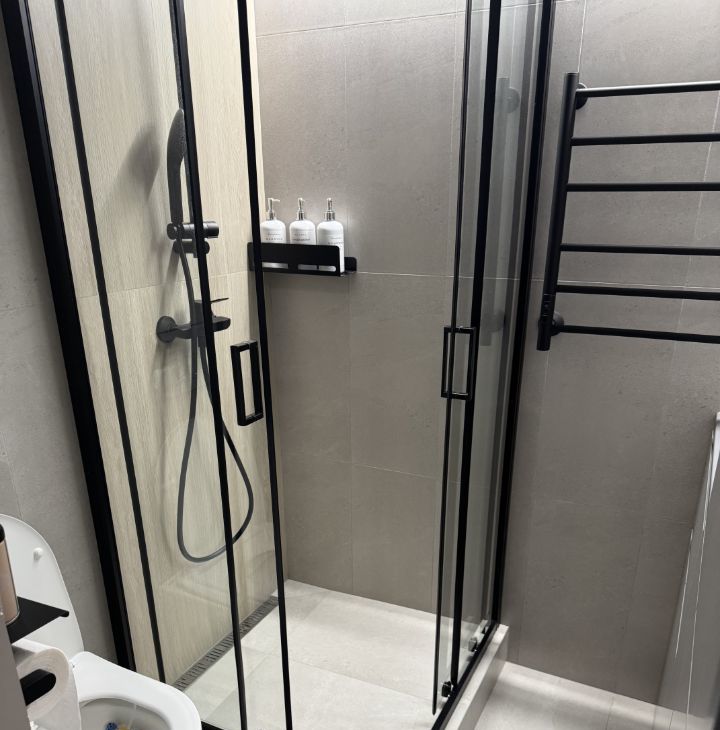 - Ванная комната оснащена душевой кабиной и стиральной машиной
