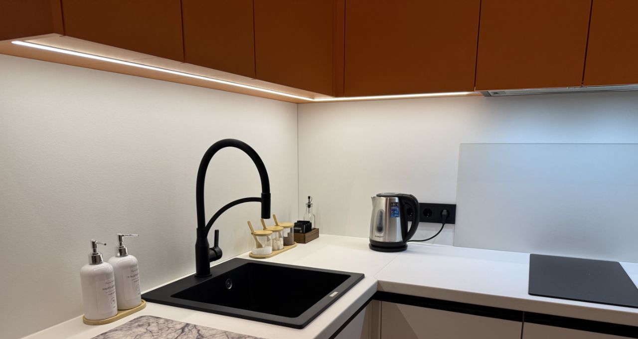 - Полностью оборудованная кухня с необходимыми кастрюлями, посудой и столовыми приборами (холодильник, микроволновая печь, индукционная плита, посудомоечная машина, чайник)