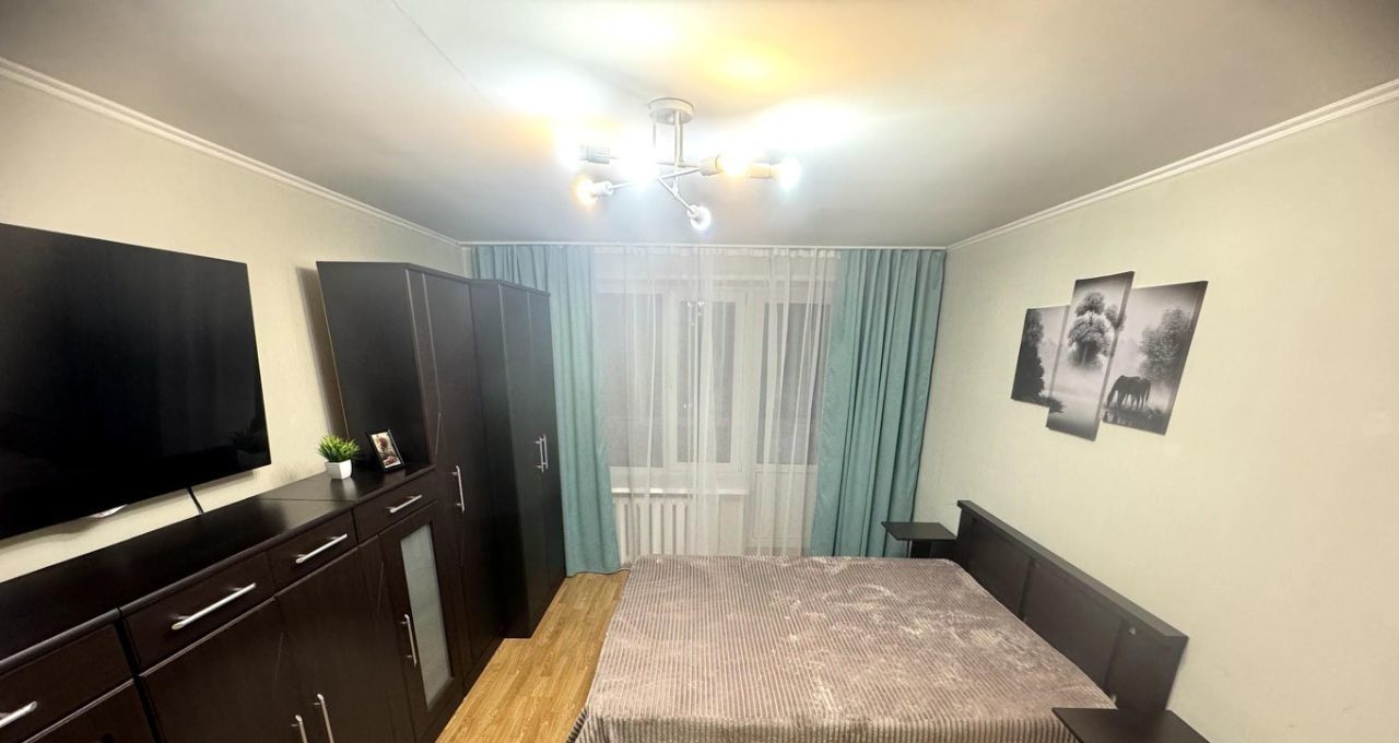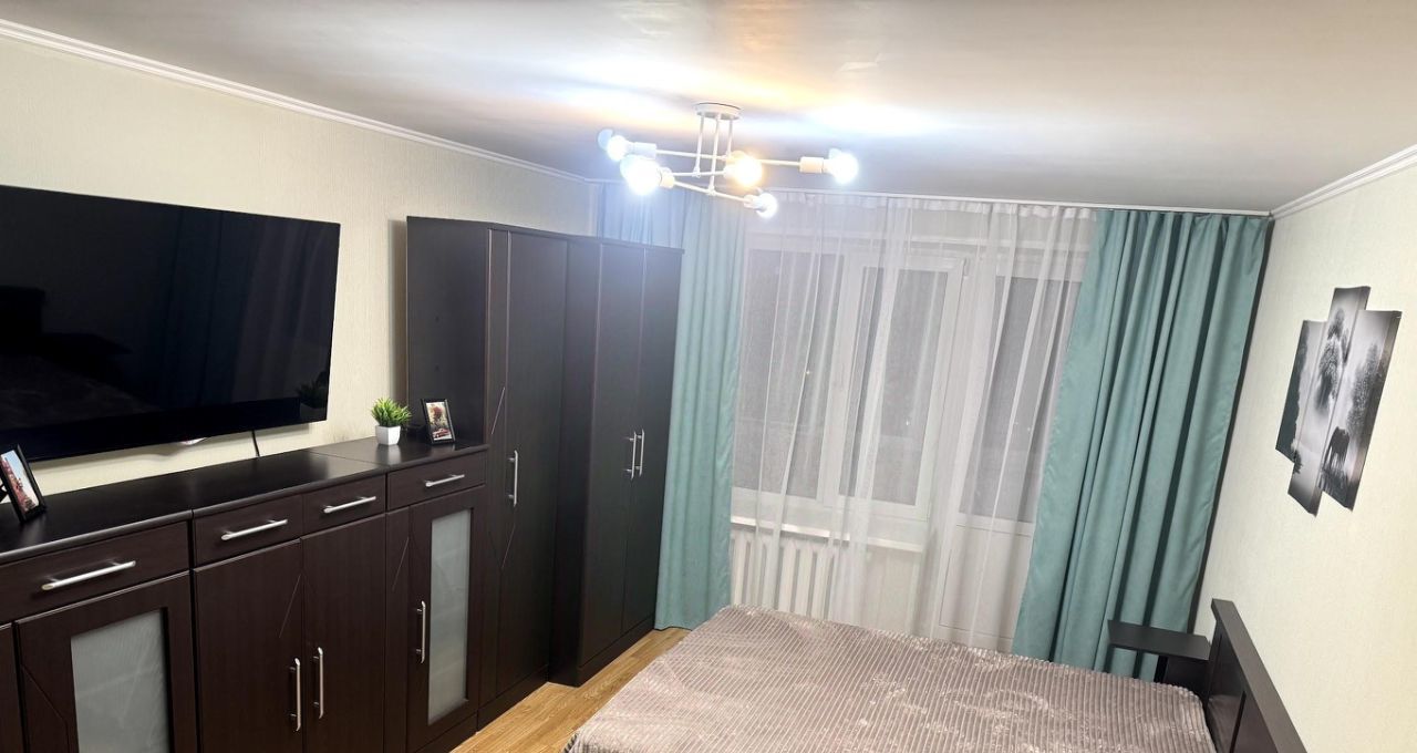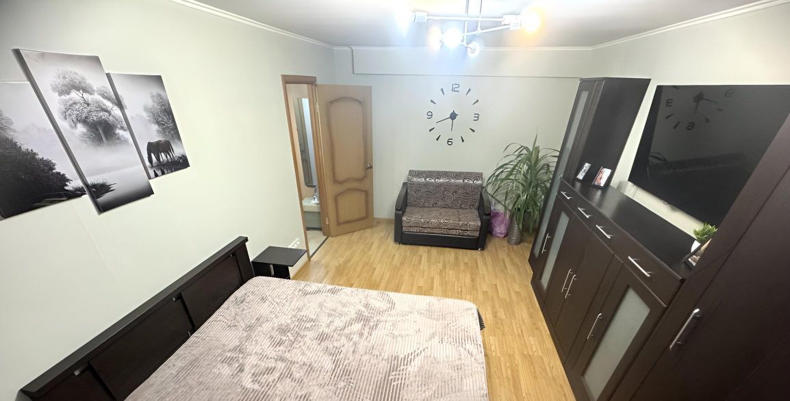 Комната: мебельная стенка, 2-х спальная кровать с ортопедическим матрасом с прикроватными столиками, диван (спальное место 120), большой телевизор, гладильная доска.