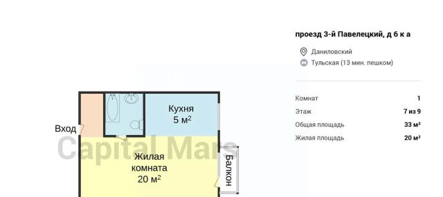 1-к кв. Москва 3-й Павелецкий проезд, 6ка (33.0 м²)