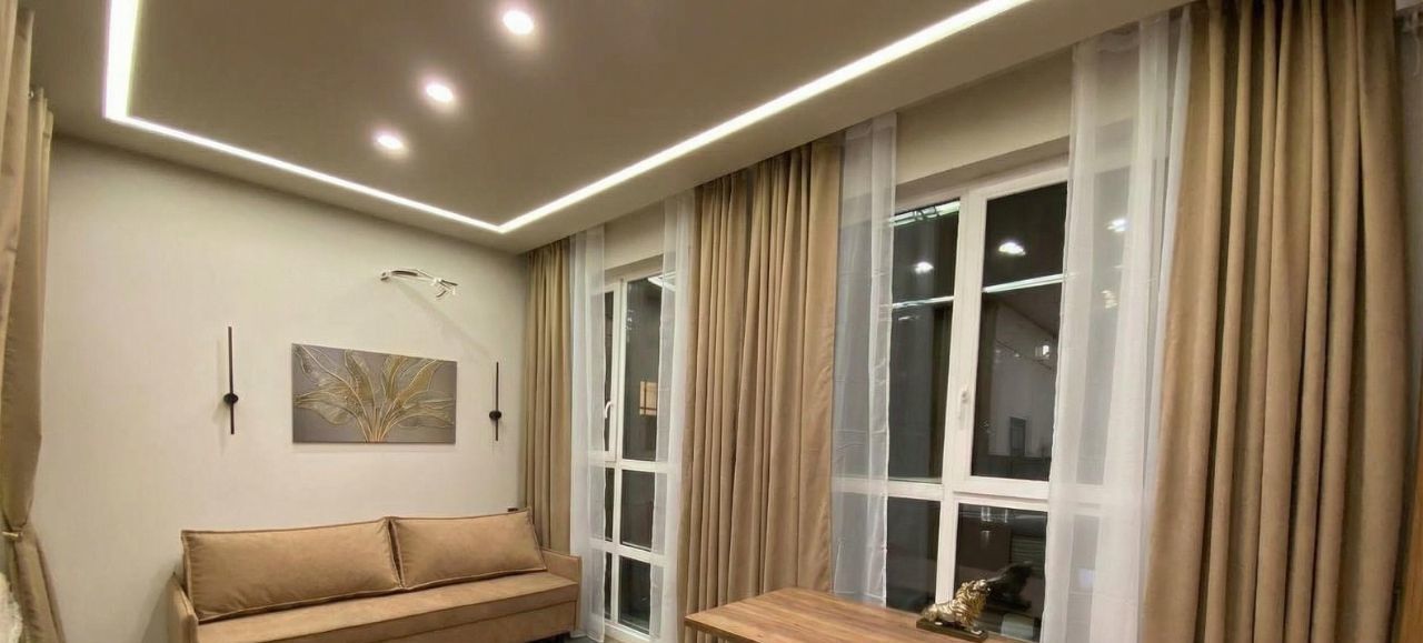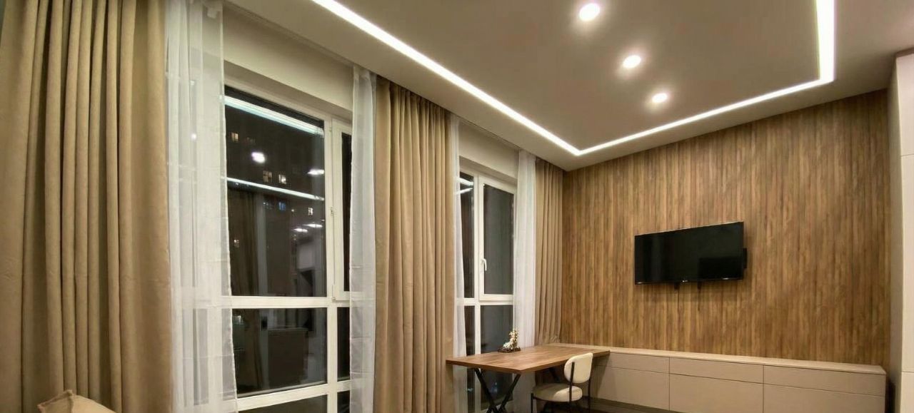 Техника: Кондиционер, стиральная машина, встроенная техника (холодильник, СВЧ, посудомоечная машина), телевизор 75", электрический чайник, пылесос.