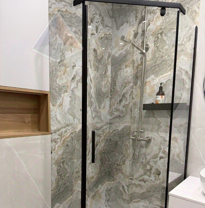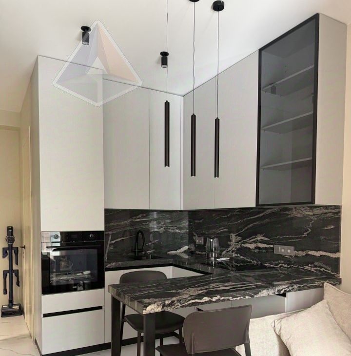 Интерьер выполнен с использованием премиальных решений. Натуральный гранит на столешнице, фартуке и подоконниках, широкоформатный керамогранит в санузле и итальянская сантехника создают ощущение роскоши. Межкомнатные двери и мебель изготовлены по индивидуальному проекту, объединяя пространство в единую гармонию.